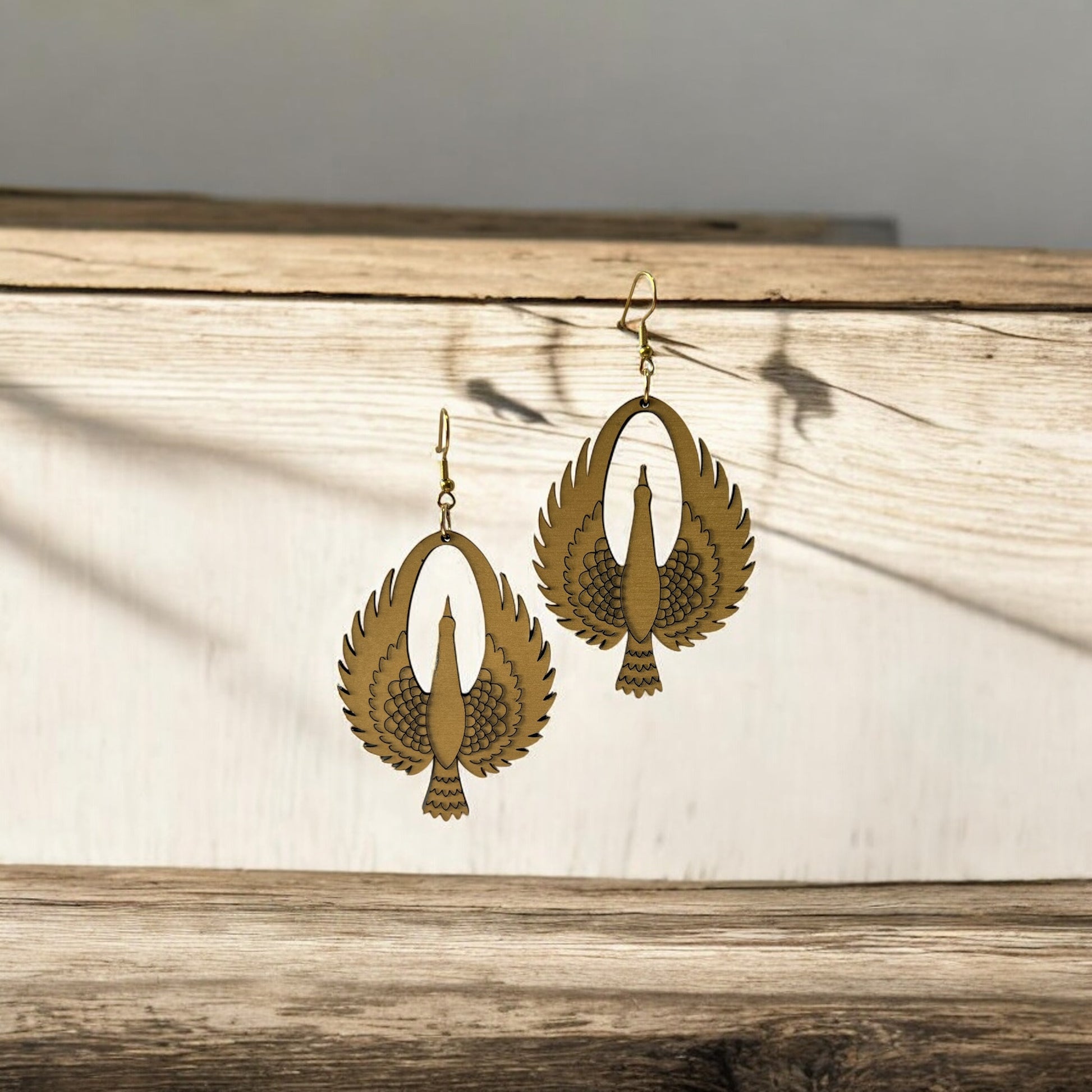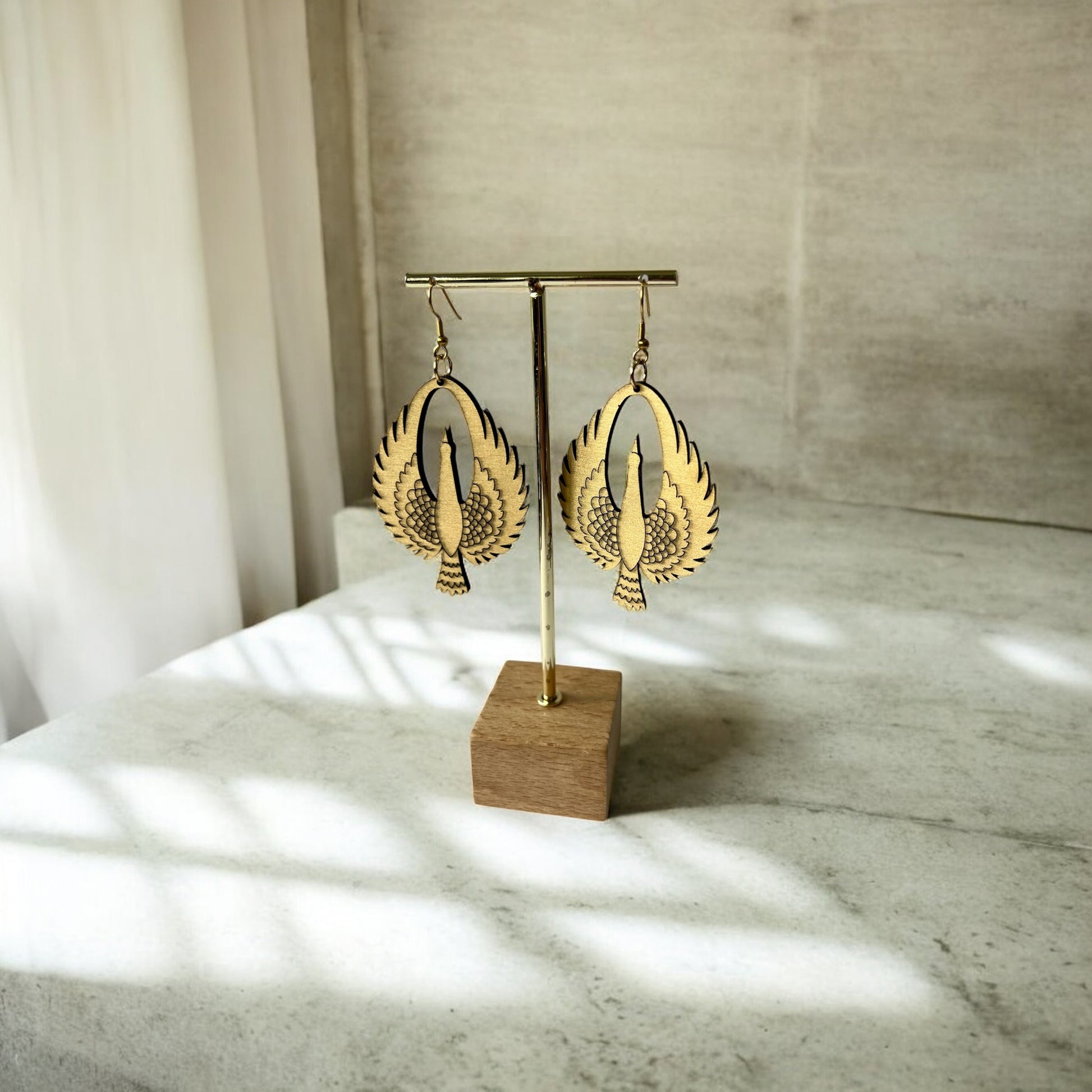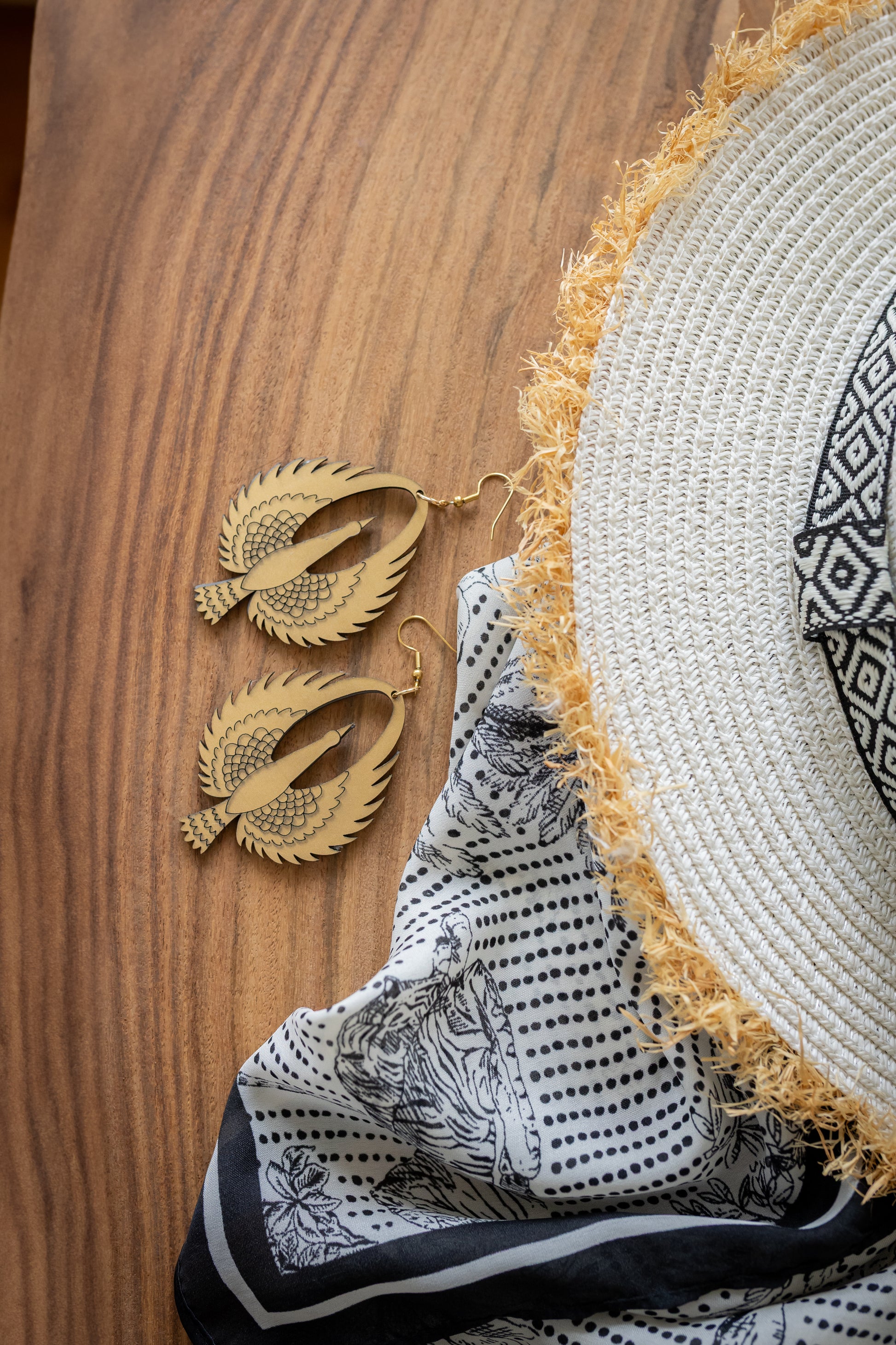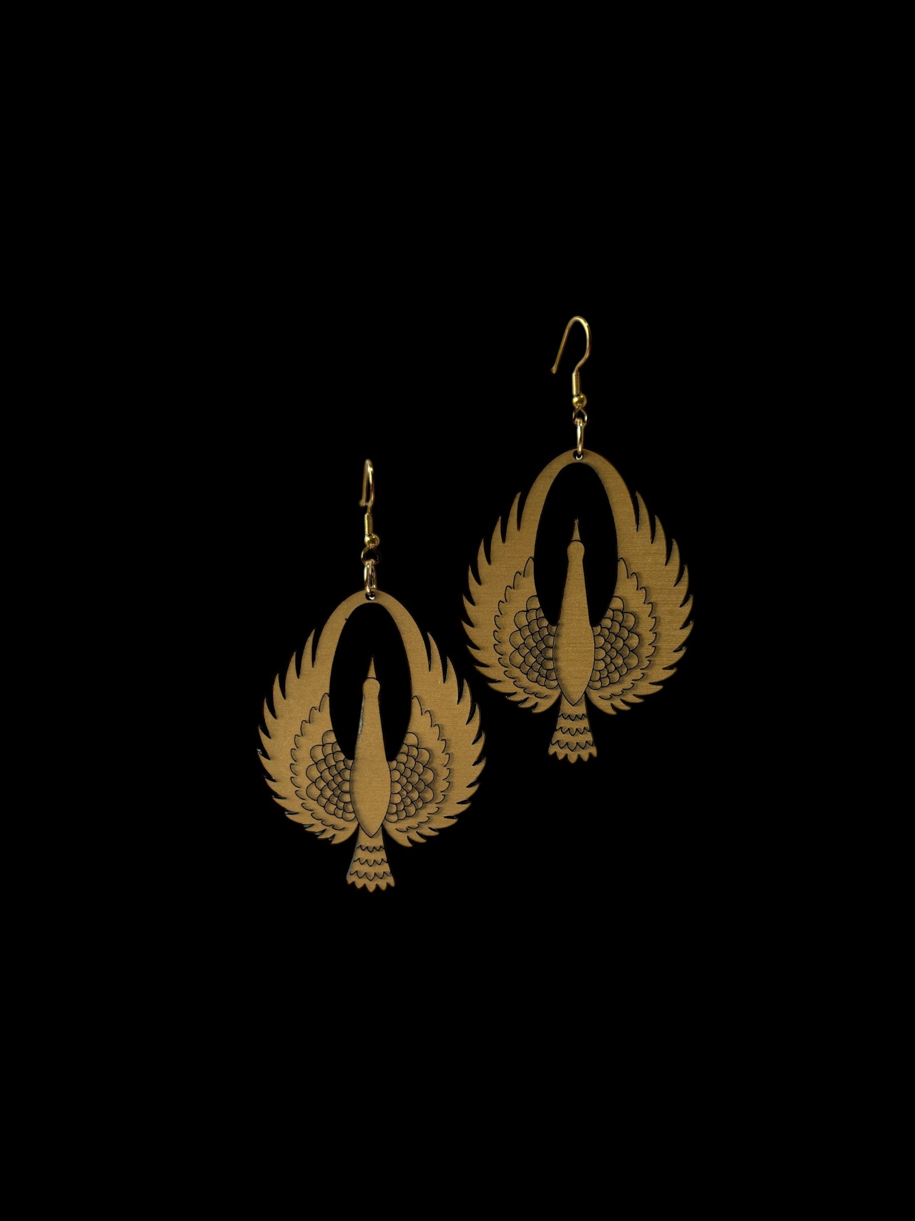 Elegant, symbolic, and rooted in tradition — the Ascent Earrings are laser-cut from soft gold-toned leather and shaped into a majestic crane mid-flight, wings fully expanded.