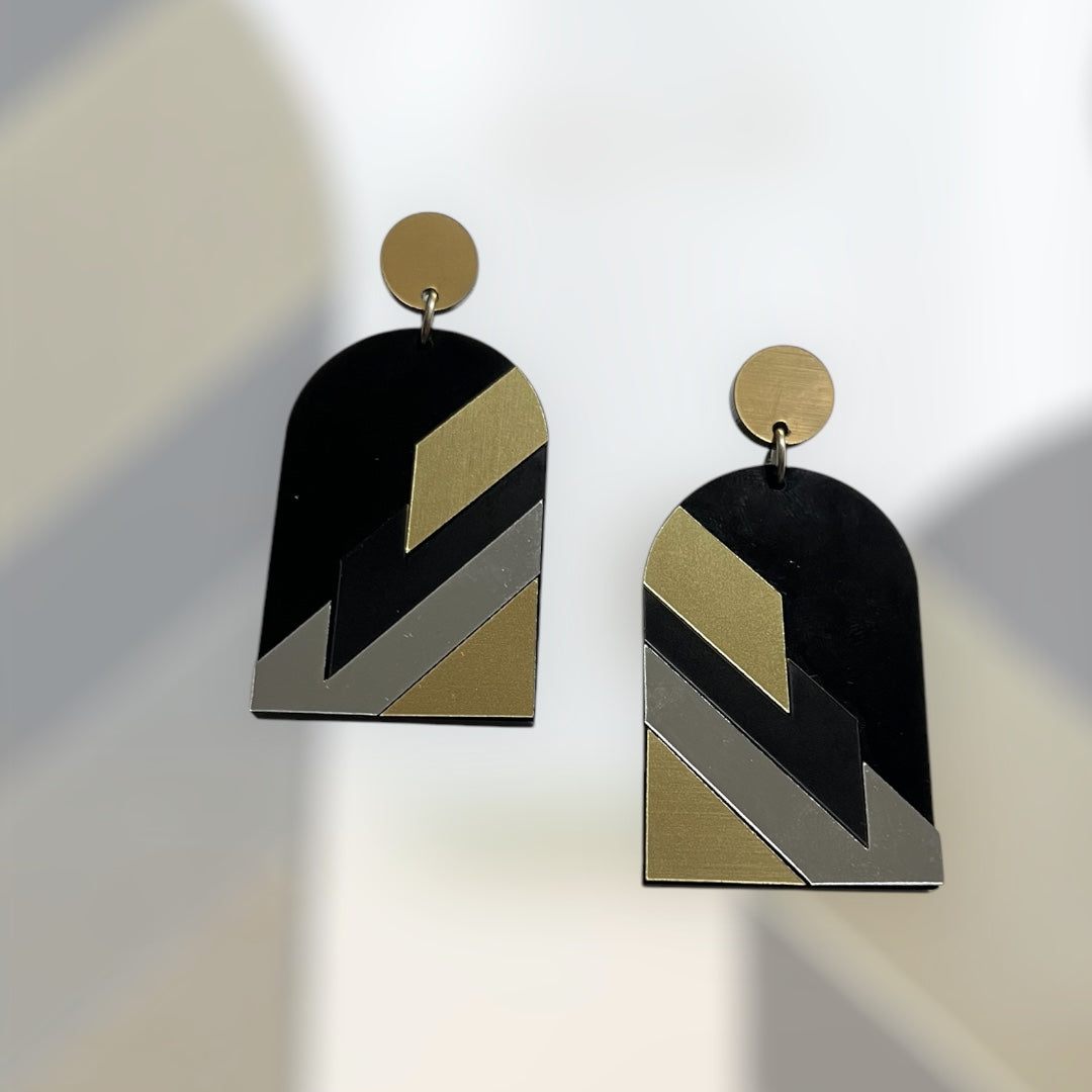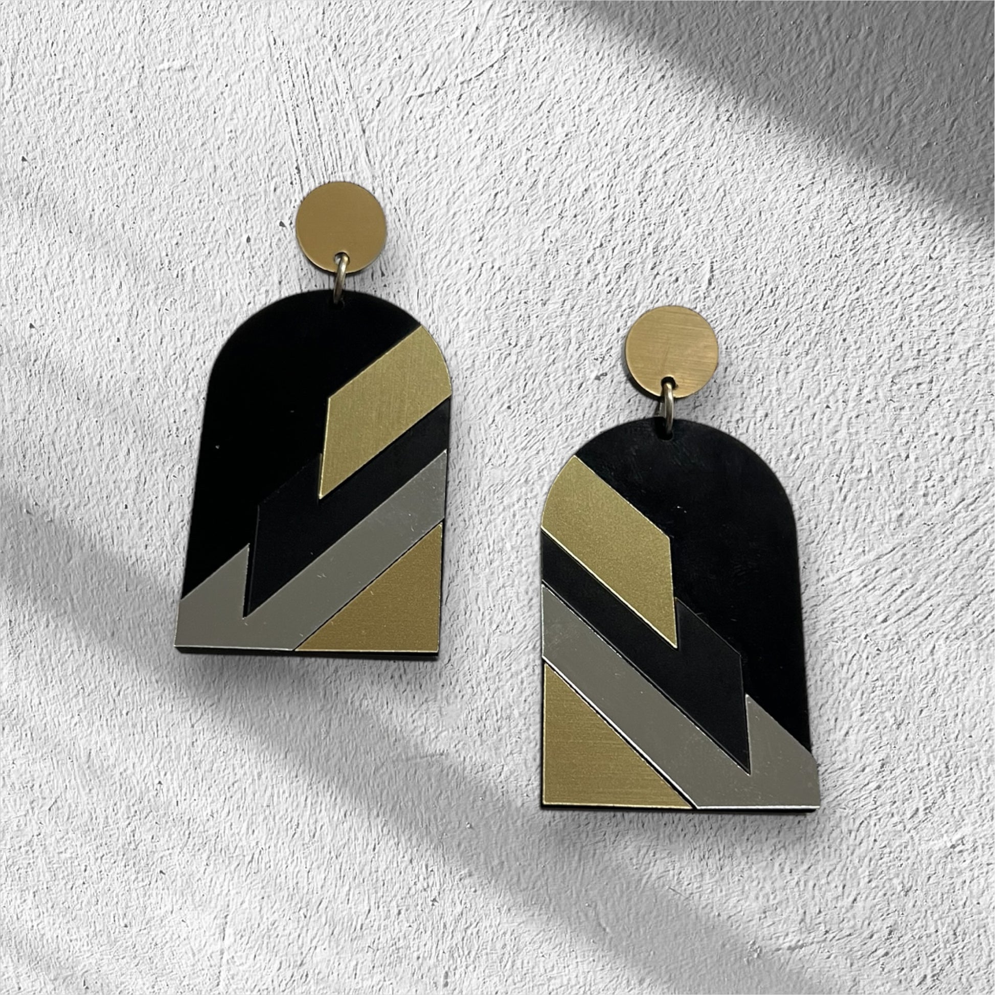 The Atelier Earrings are a bold fusion of black, silver, and gold, embodying the timeless allure of geometric Art Deco design. Their striking combination of colors and shapes creates a powerful statement, blending elegance with a modern edge. Lightweight yet impactful, these earrings are the perfect accessory for those who love sophisticated, edgy style. Ideal for adding a touch of glamour and individuality to any look.