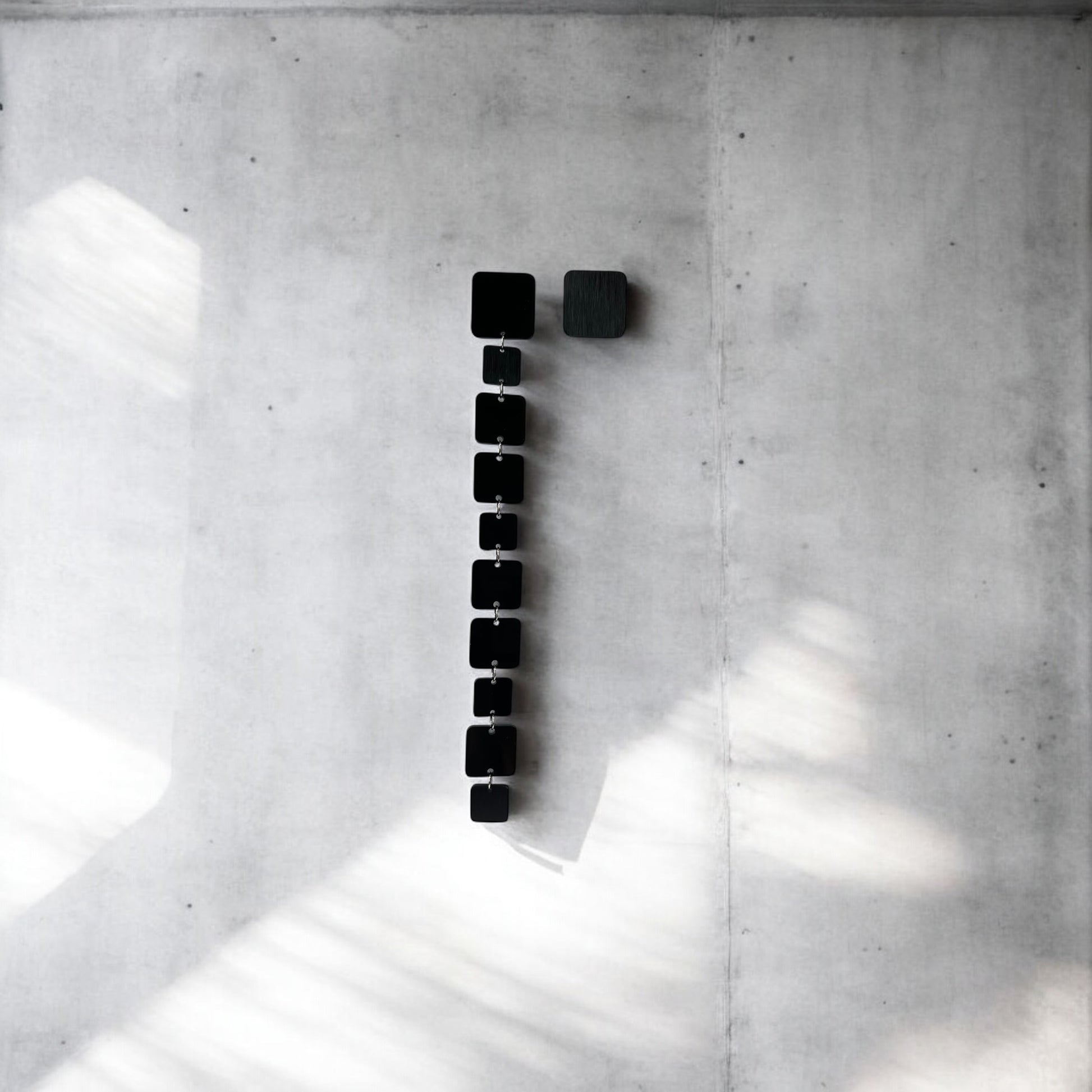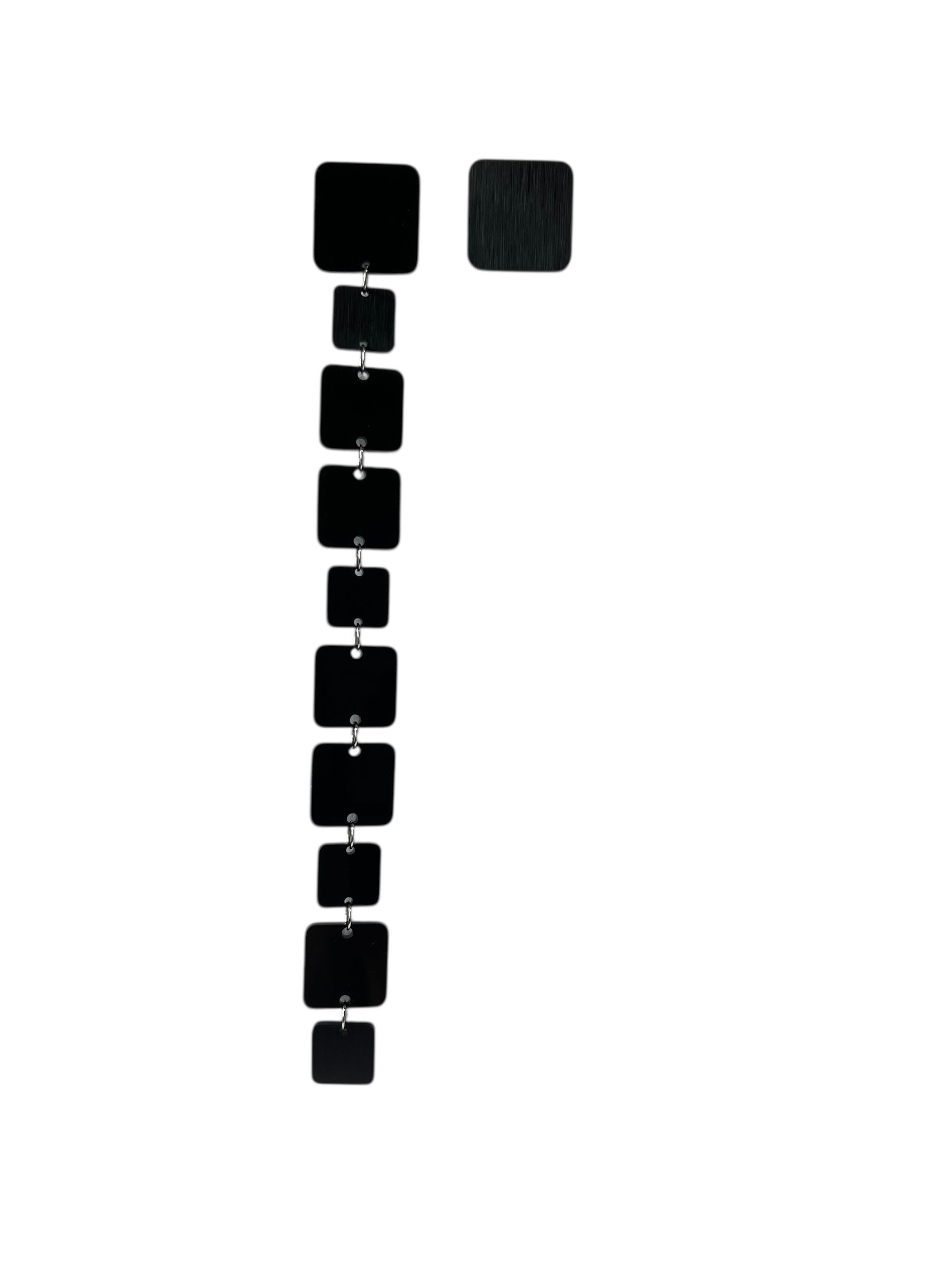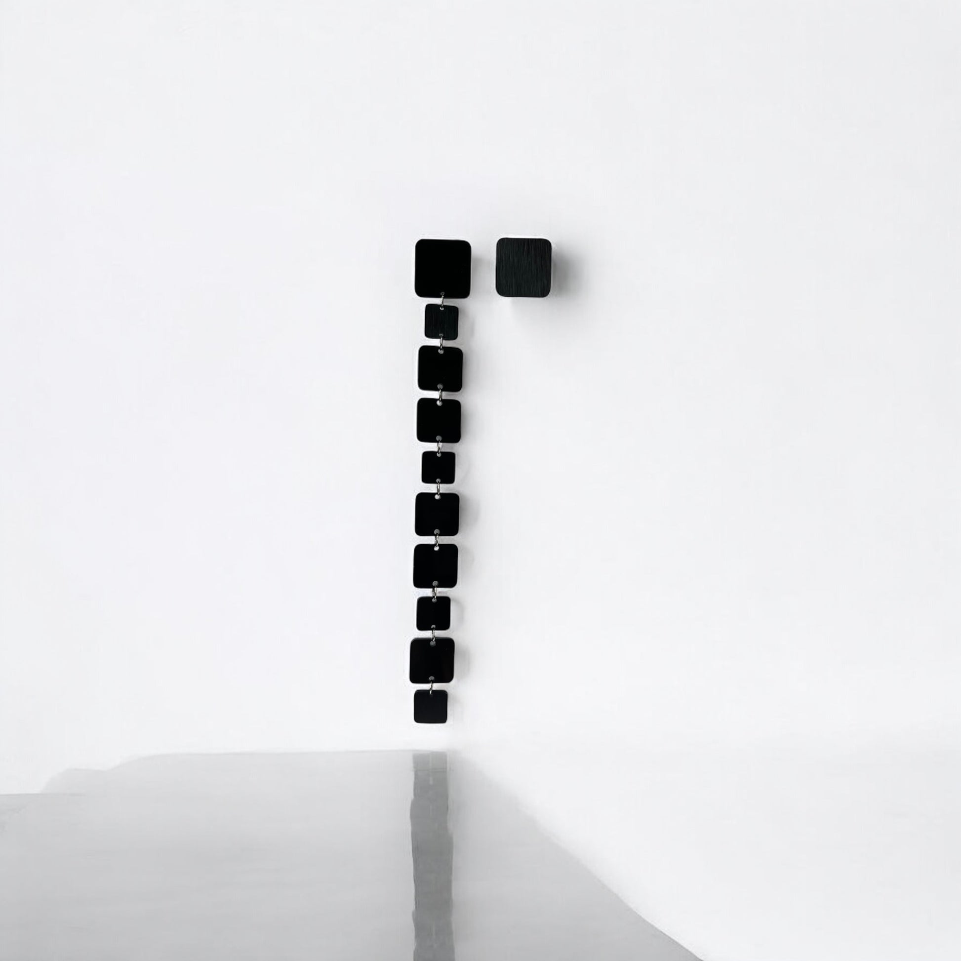 Axis is anything but conventional — and that’s the point. One side features a bold square stud (3 cm x 3 cm)while the other cascades into a chain of geometric squares (25 cm long x 3 cm wide).