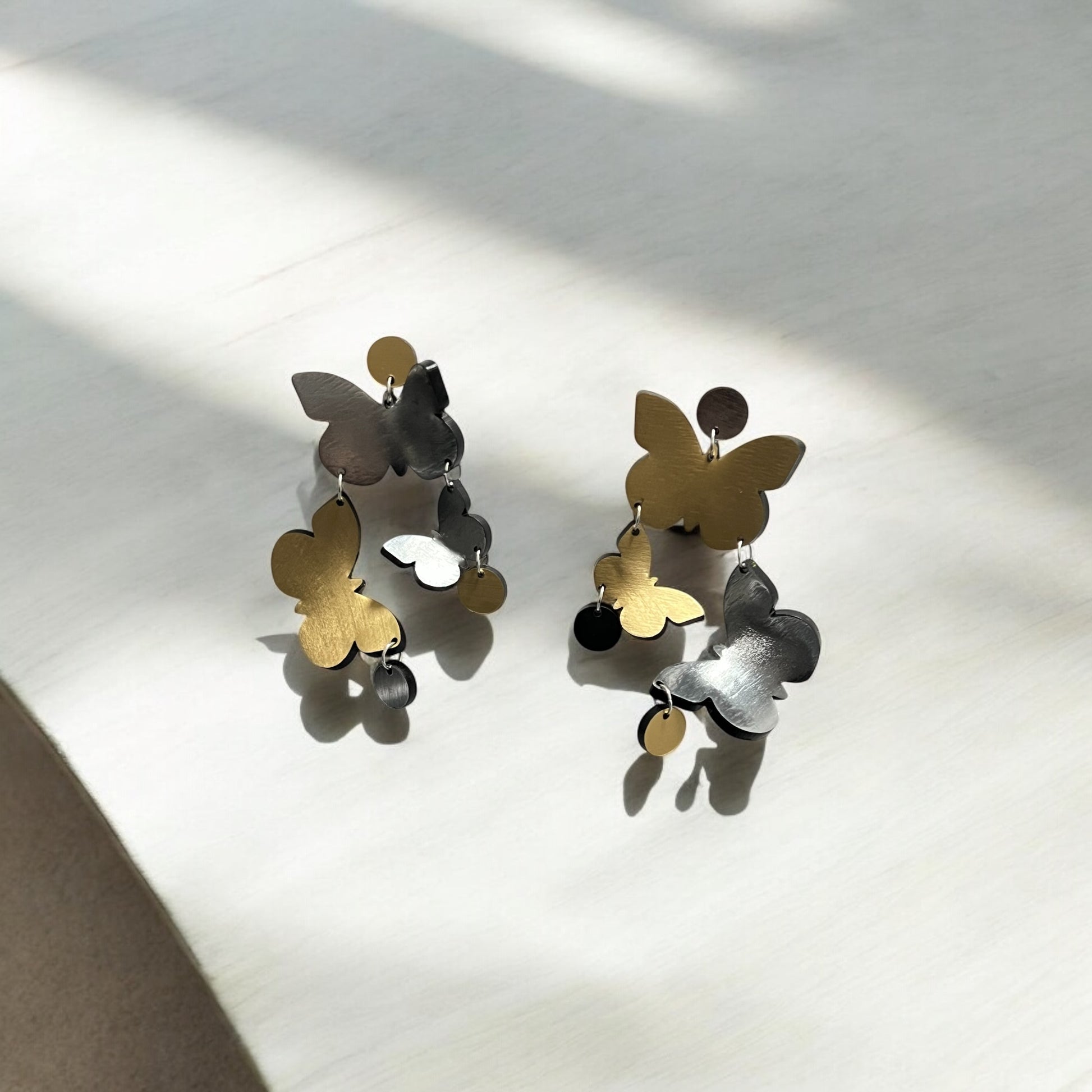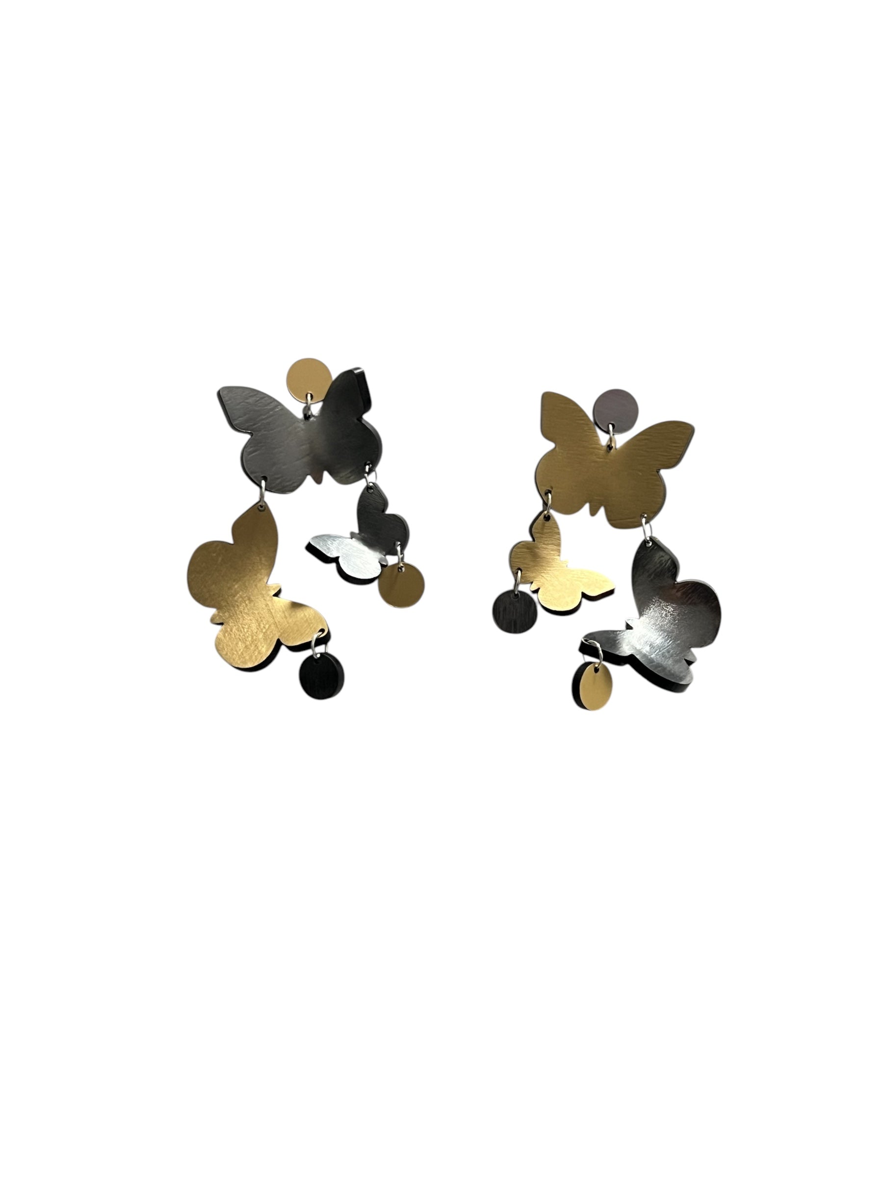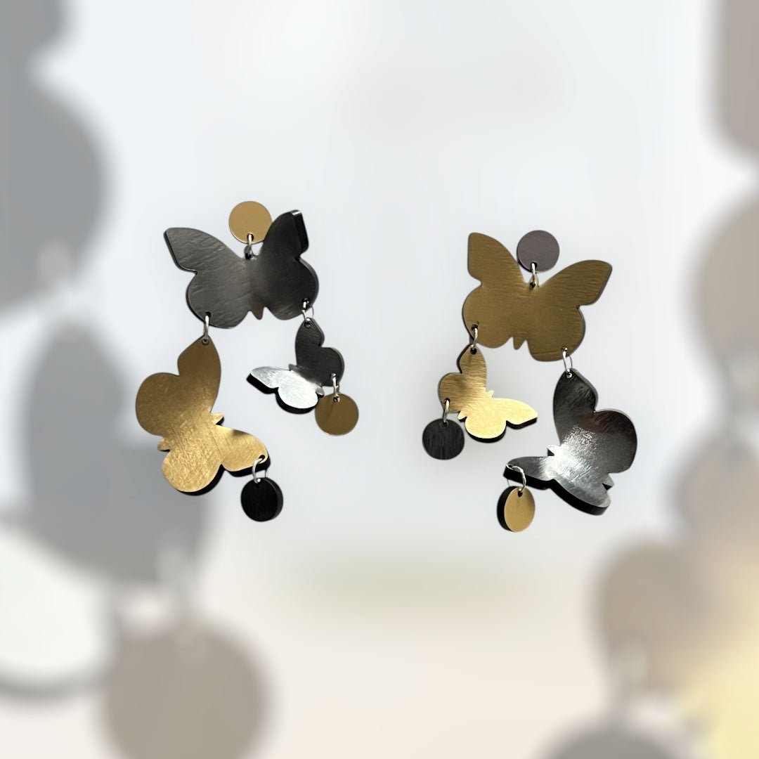 The Flutter Earrings are a stunning embodiment of grace and movement, featuring another exquisite take on butterflies in motion. Hand-formed from luminous metallic acrylic, these earrings showcase a captivating 3D effect that brings their design to life. Feminine and bold, they offer an elegant yet striking accessory for any occasion.
