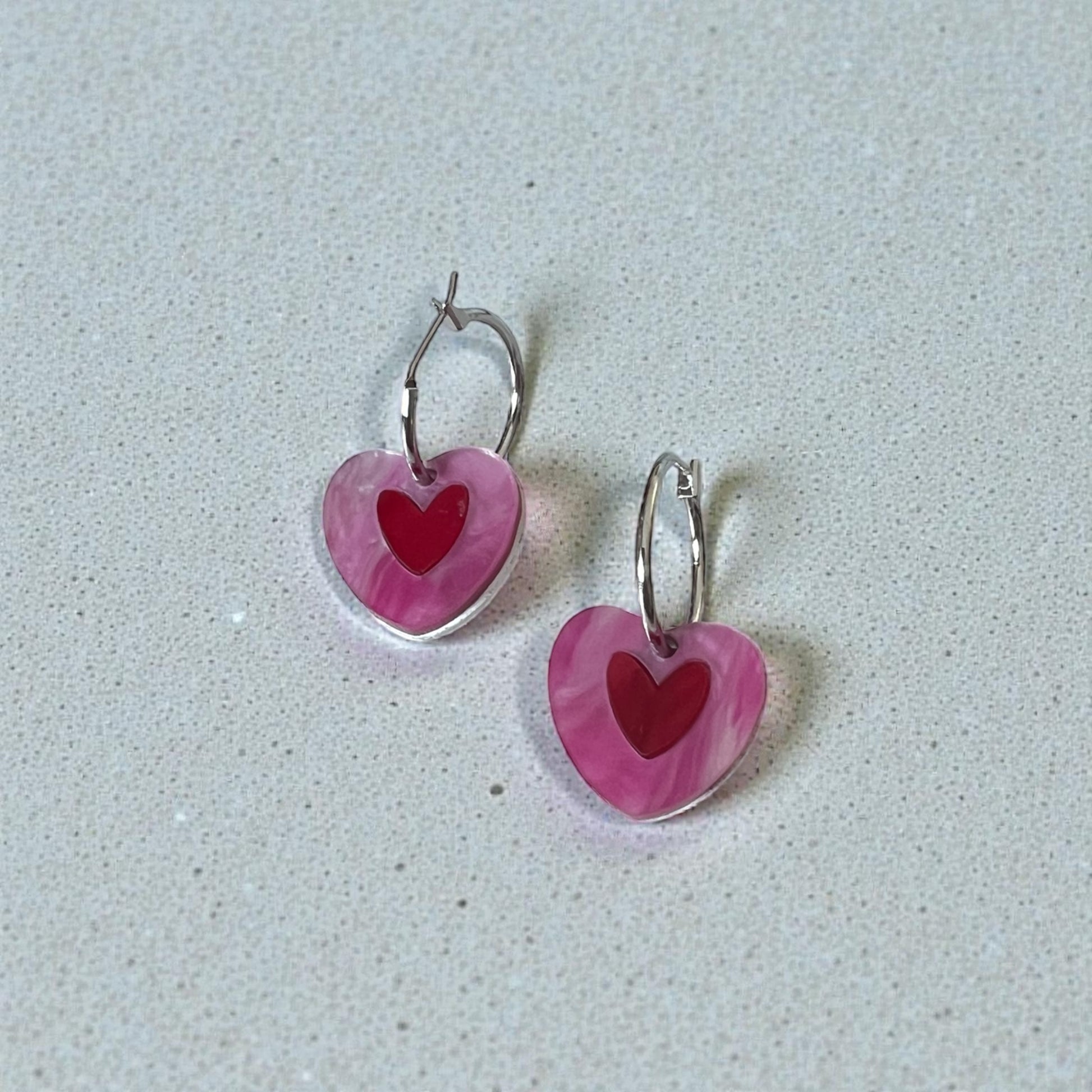 Delicate yet expressive, the Heartstring Earrings are a poetic nod to connection, love, and movement. Featuring a softly marbled acrylic heart layered with a bold inner heart, these earrings balance playful charm with thoughtful design.