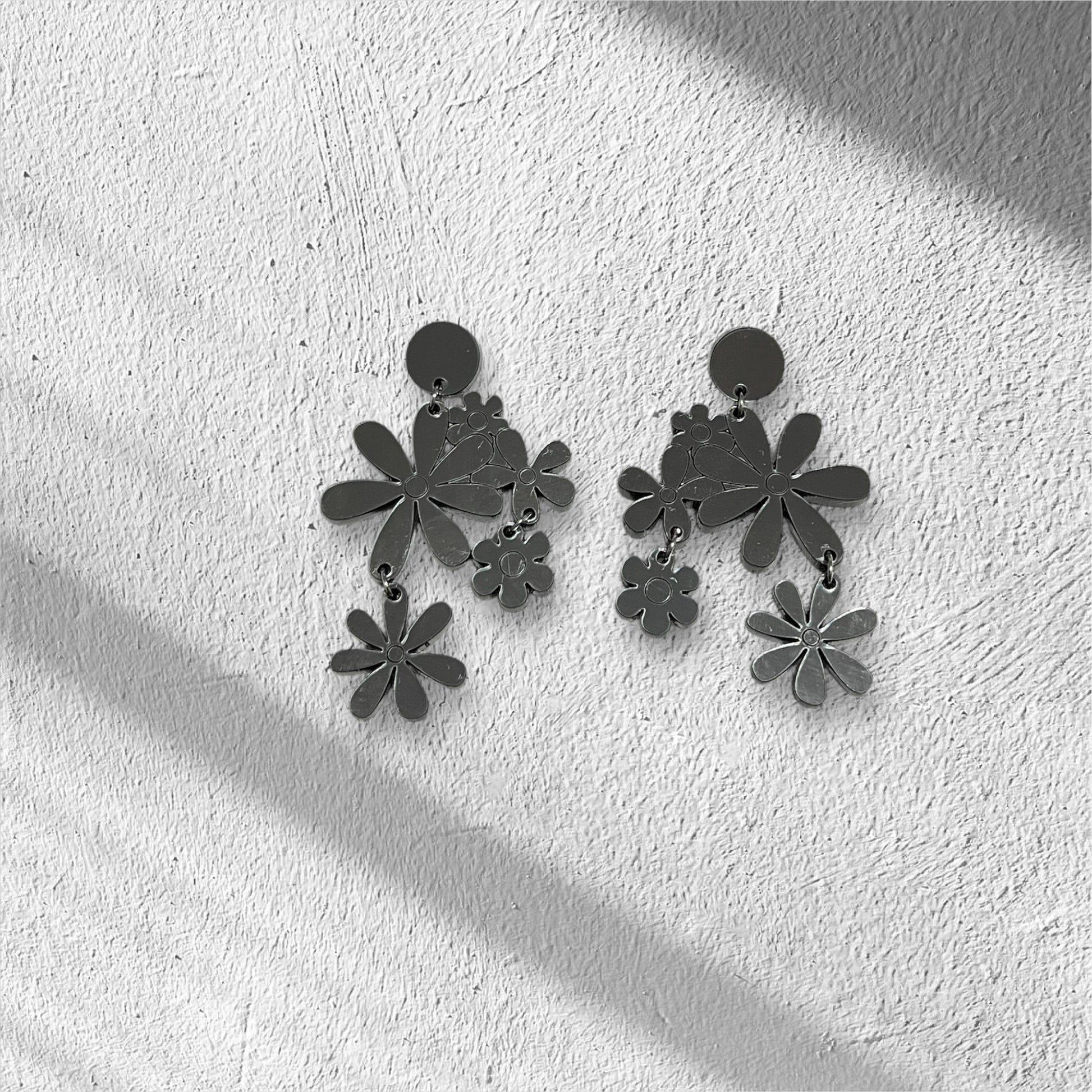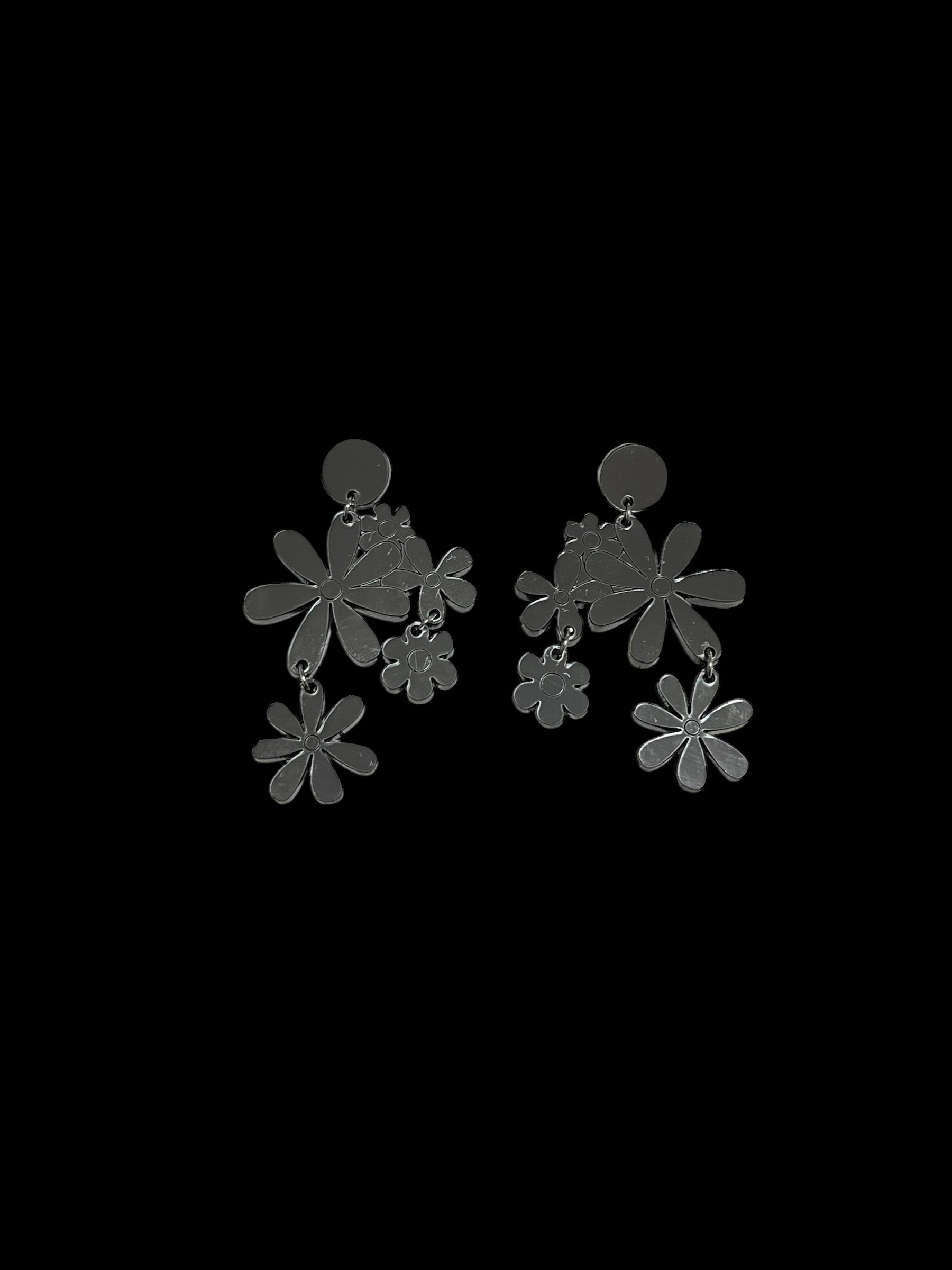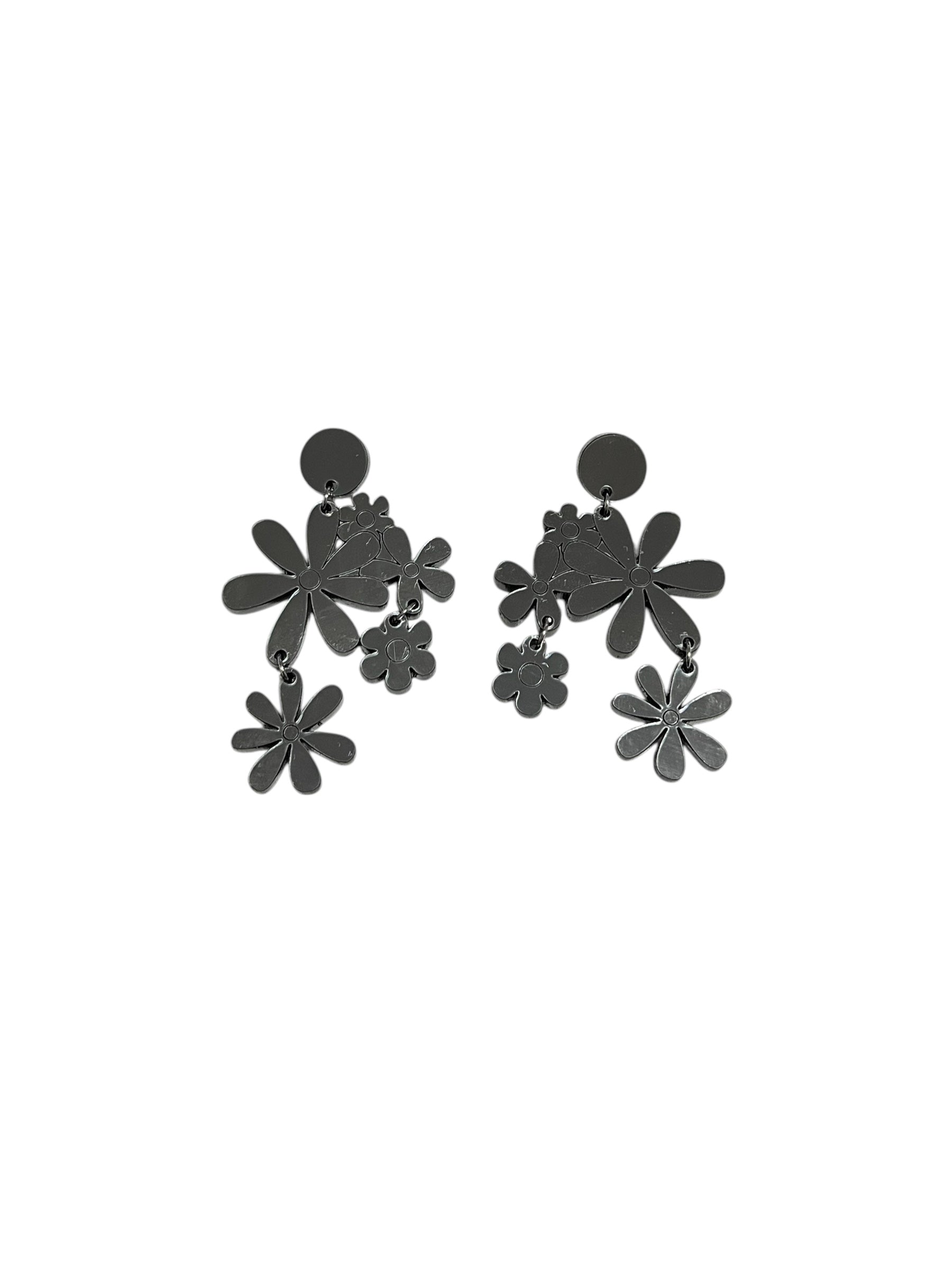 The Mod Meadows Earrings are a playful homage to 70’s retro style, featuring dangling asymmetrical flower designs crafted from sleek silver metallic acrylic. Their bold yet whimsical aesthetic captures the groovy essence of the era, reimagined with a modern, edgy twist. Lightweight and eye-catching, these earrings are perfect for making a fun, stylish statement.