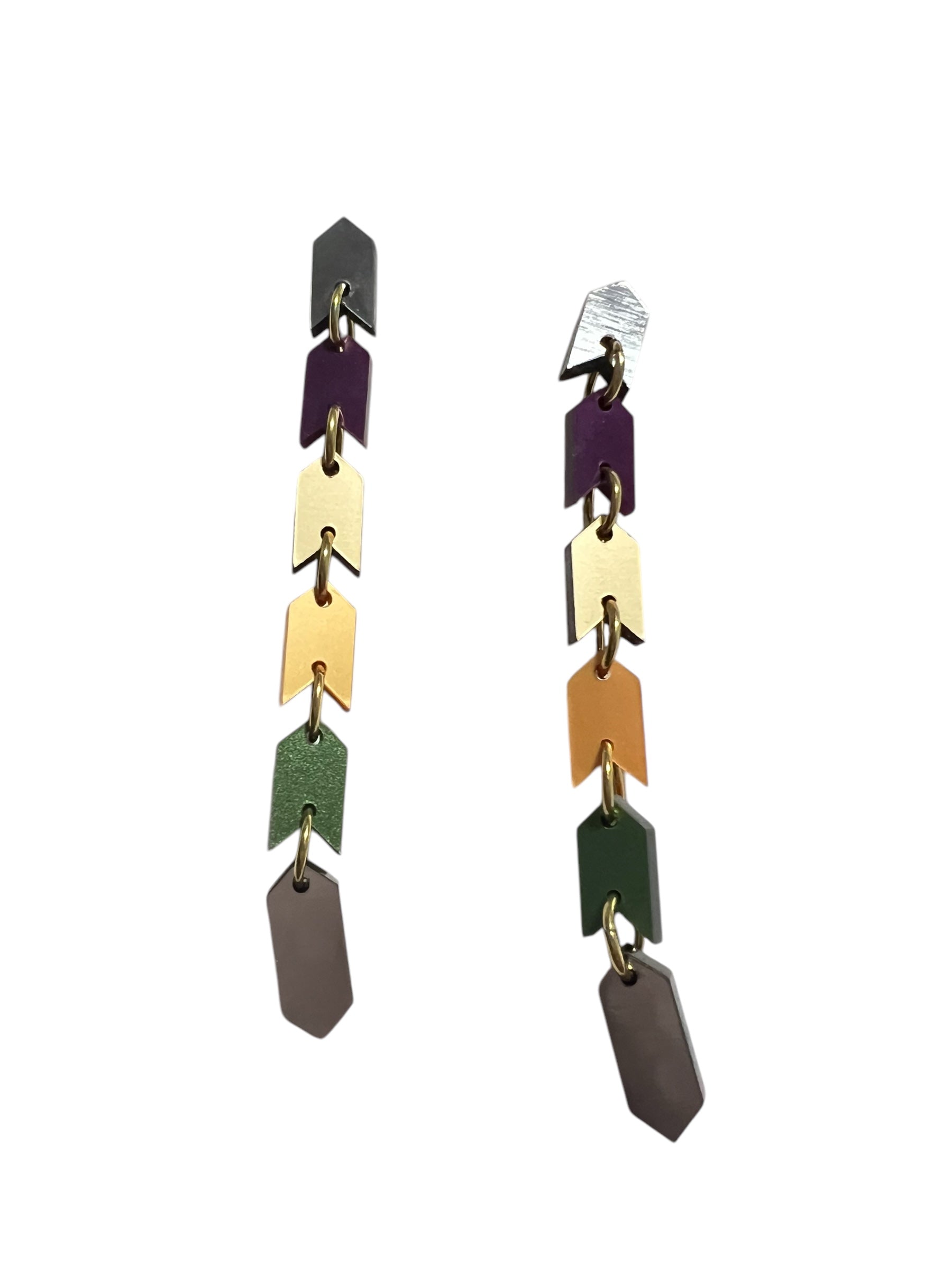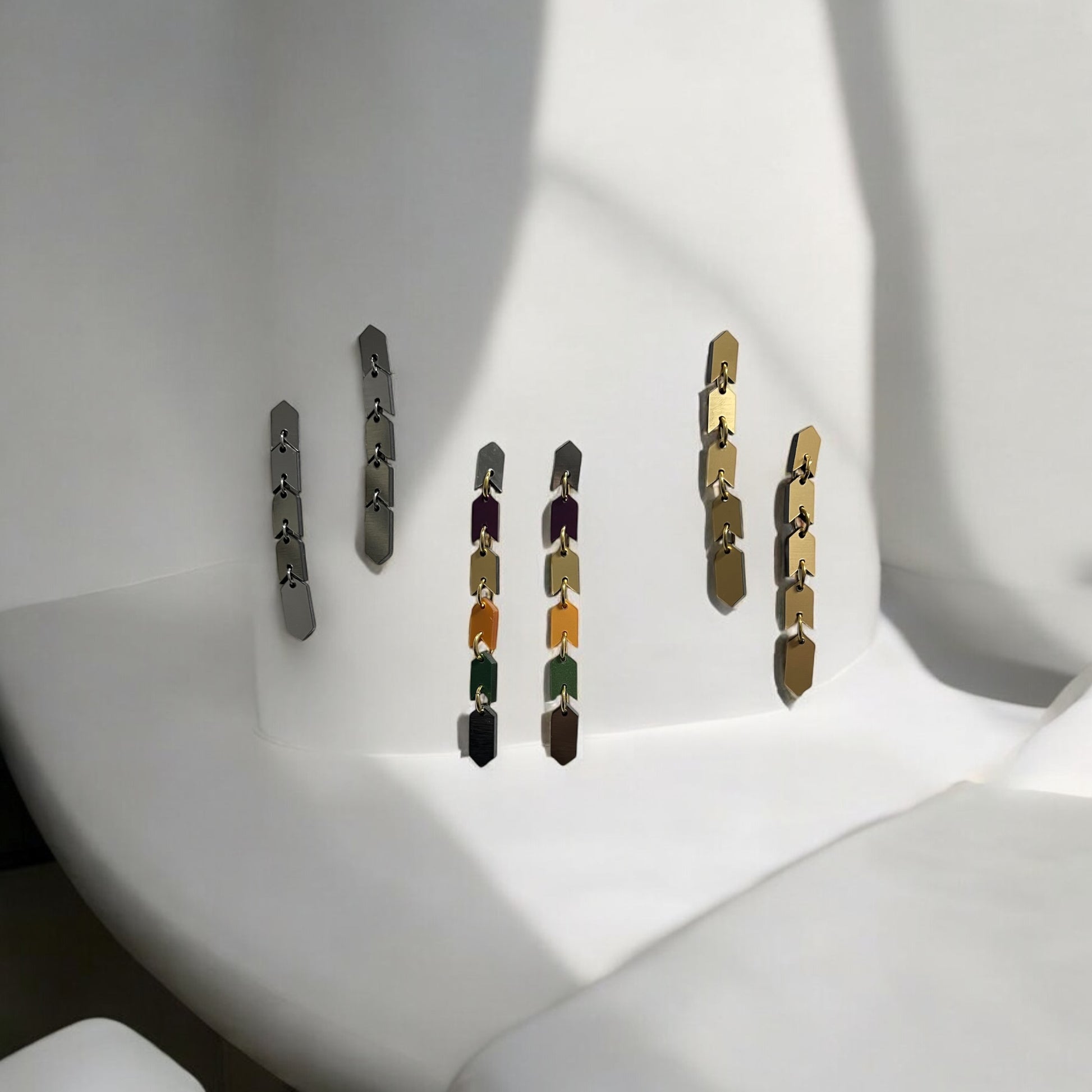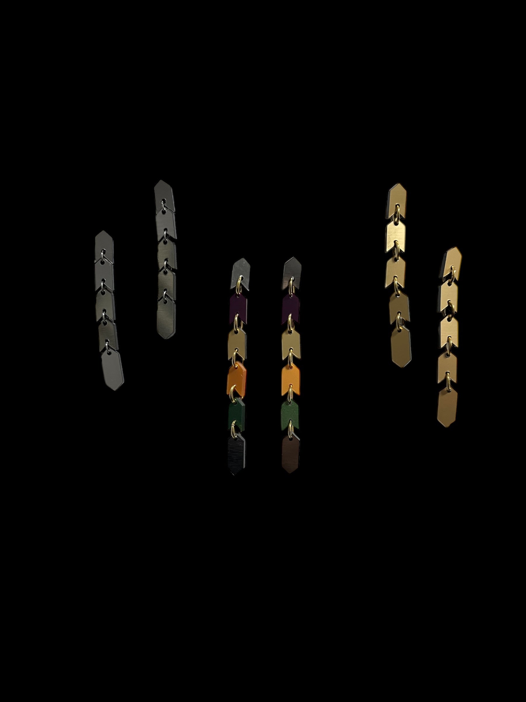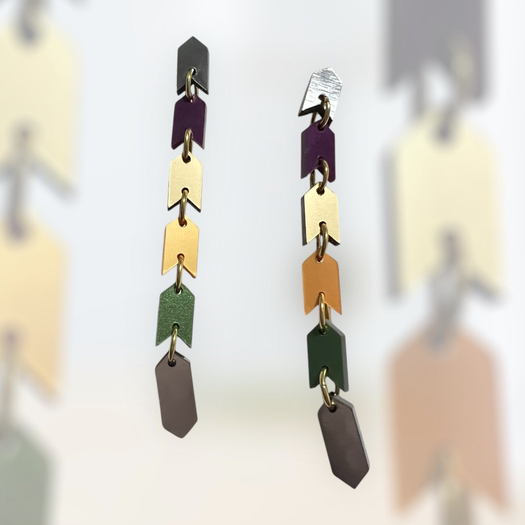 The Sahem Earrings are a sleek chain of arrow-shaped links that exude modern, edgy sophistication. Their unique, snake-like design flows effortlessly, creating a bold and striking accessory for those who love to stand out. Cool, contemporary, and unapologetically daring, these earrings come in two sizes: the gold and silver versions are 8 cm long, while the vibrant multi-colour metallic version extends to 9.5 cm for an even bolder statement. Perfect for the fearless wearer seeking a sleek and unforgettable design.