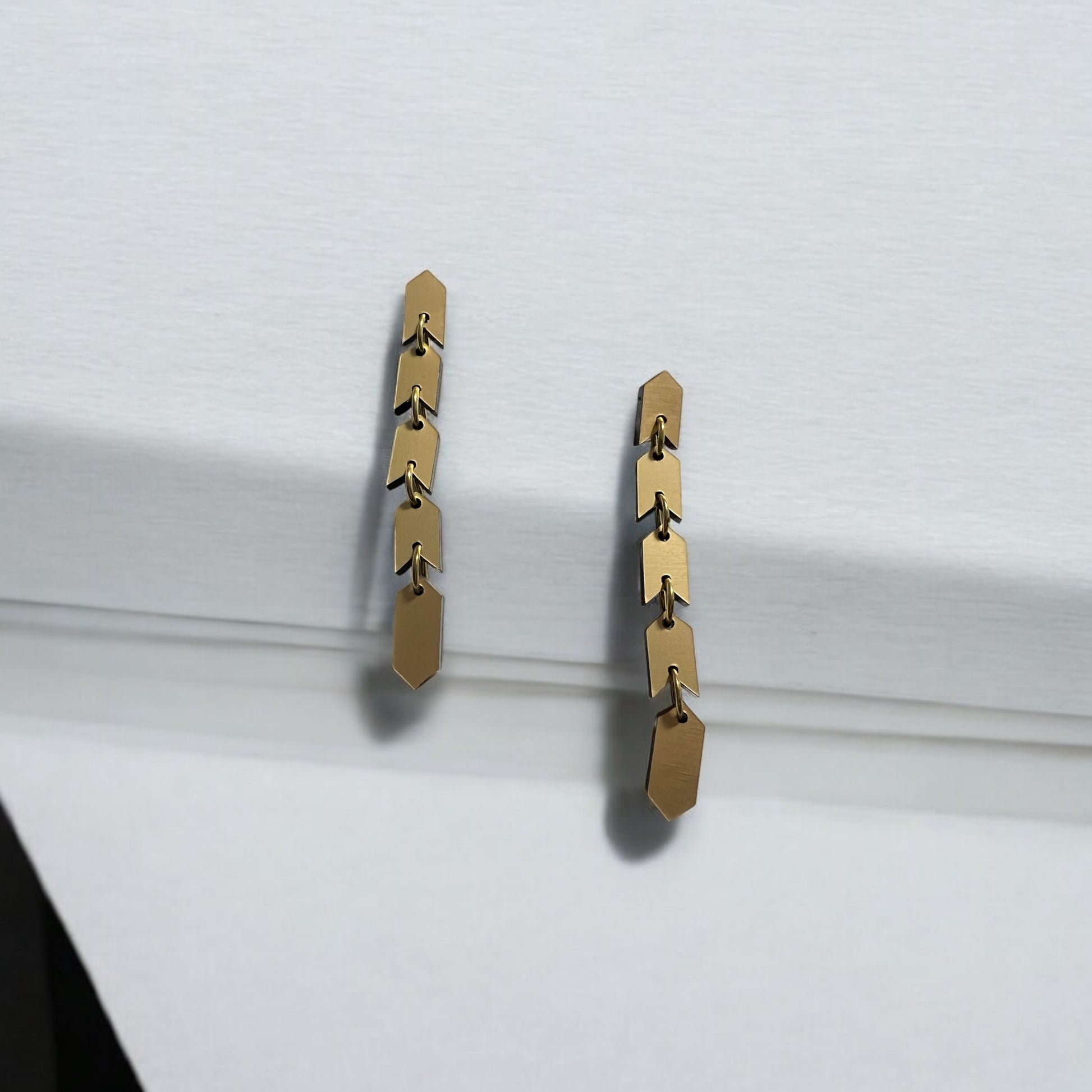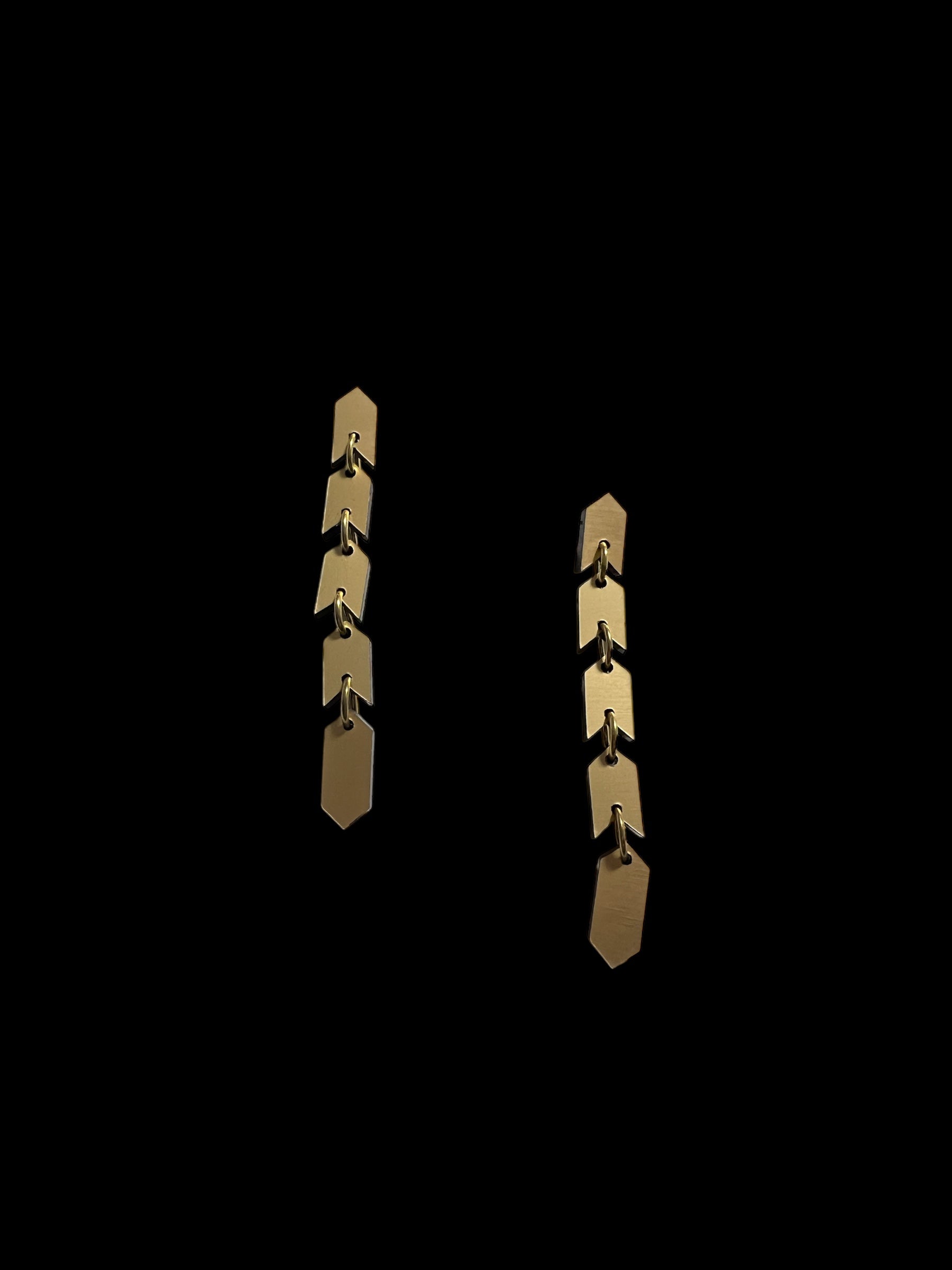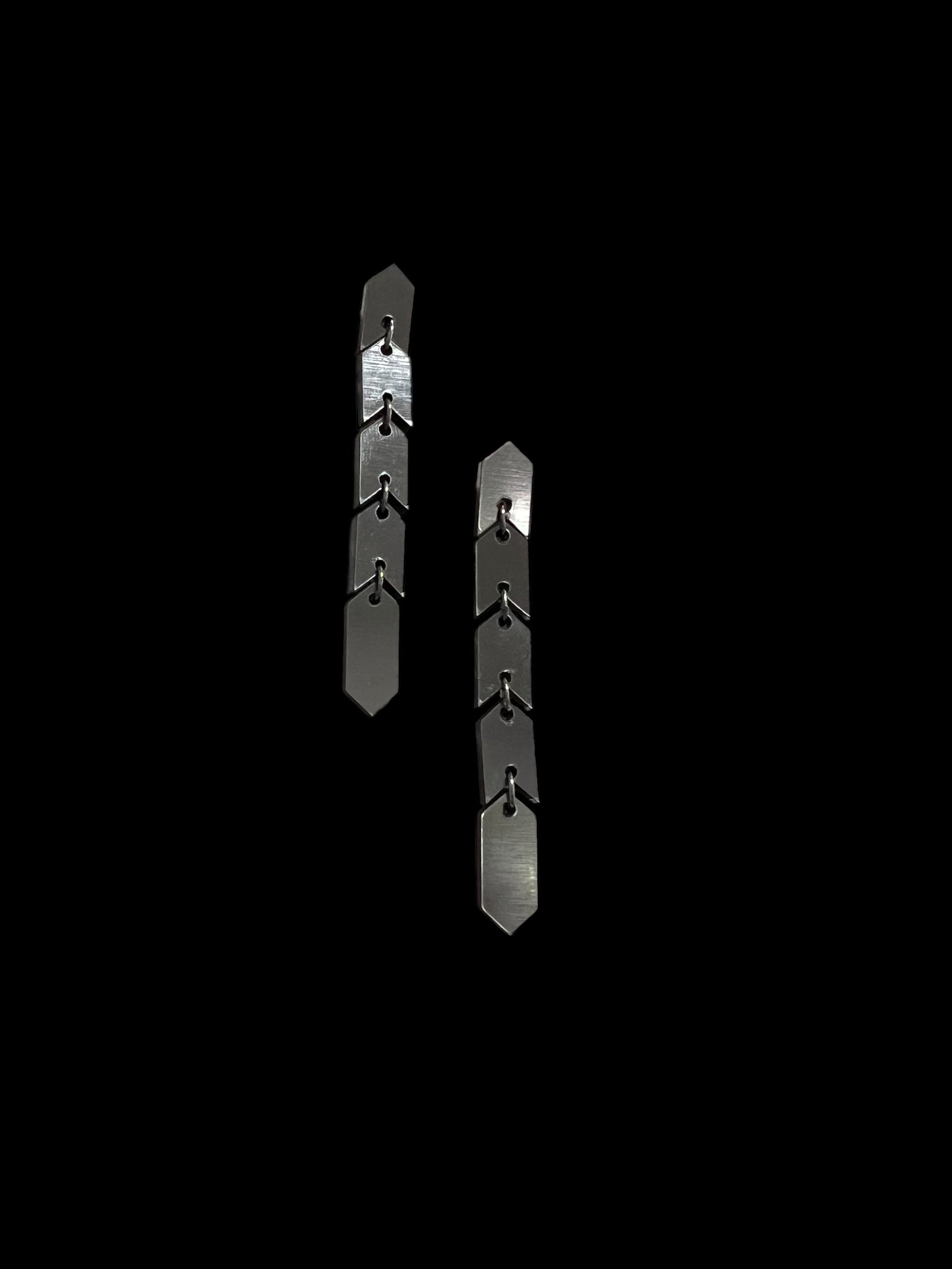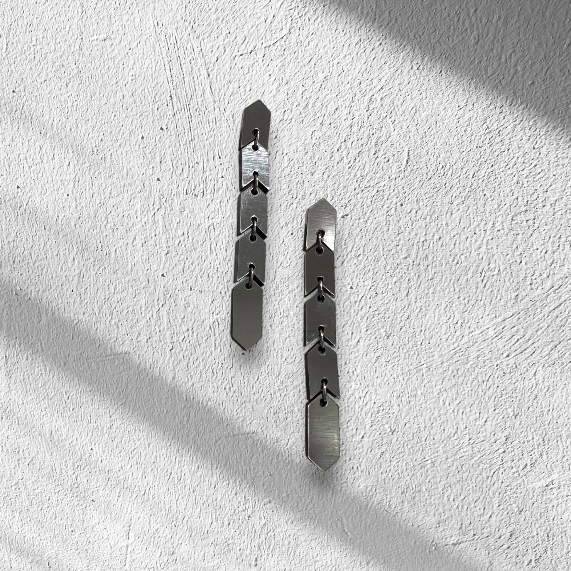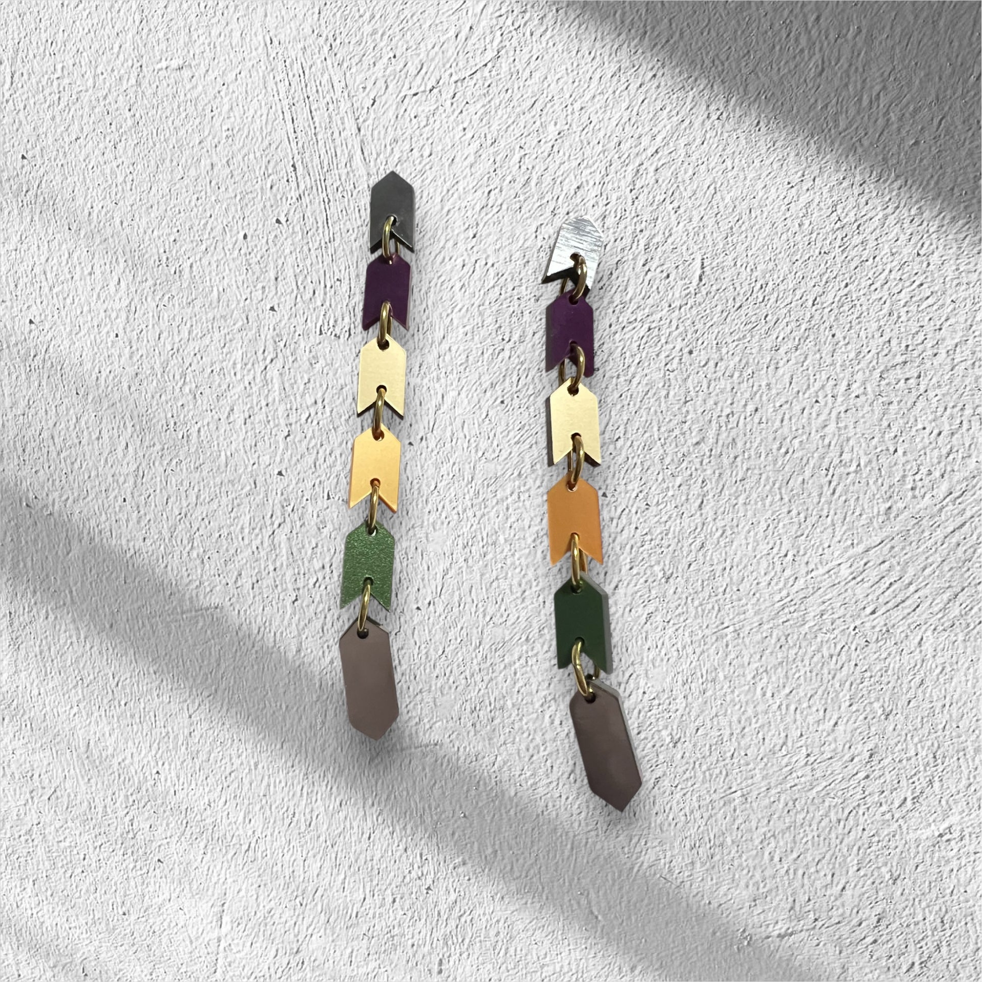 The Sahem Earrings are a sleek chain of arrow-shaped links that exude modern, edgy sophistication. Their unique, snake-like design flows effortlessly, creating a bold and striking accessory for those who love to stand out. Cool, contemporary, and unapologetically daring, these earrings come in two sizes: the gold and silver versions are 8 cm long, while the vibrant multi-colour metallic version extends to 9.5 cm for an even bolder statement. Perfect for the fearless wearer seeking a sleek and unforgettable design.