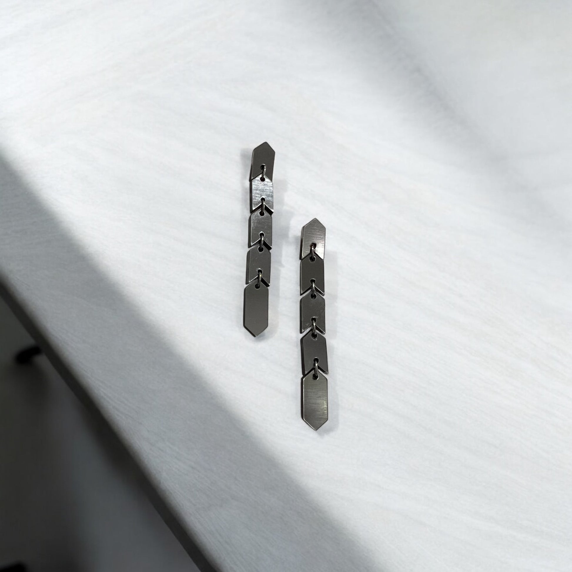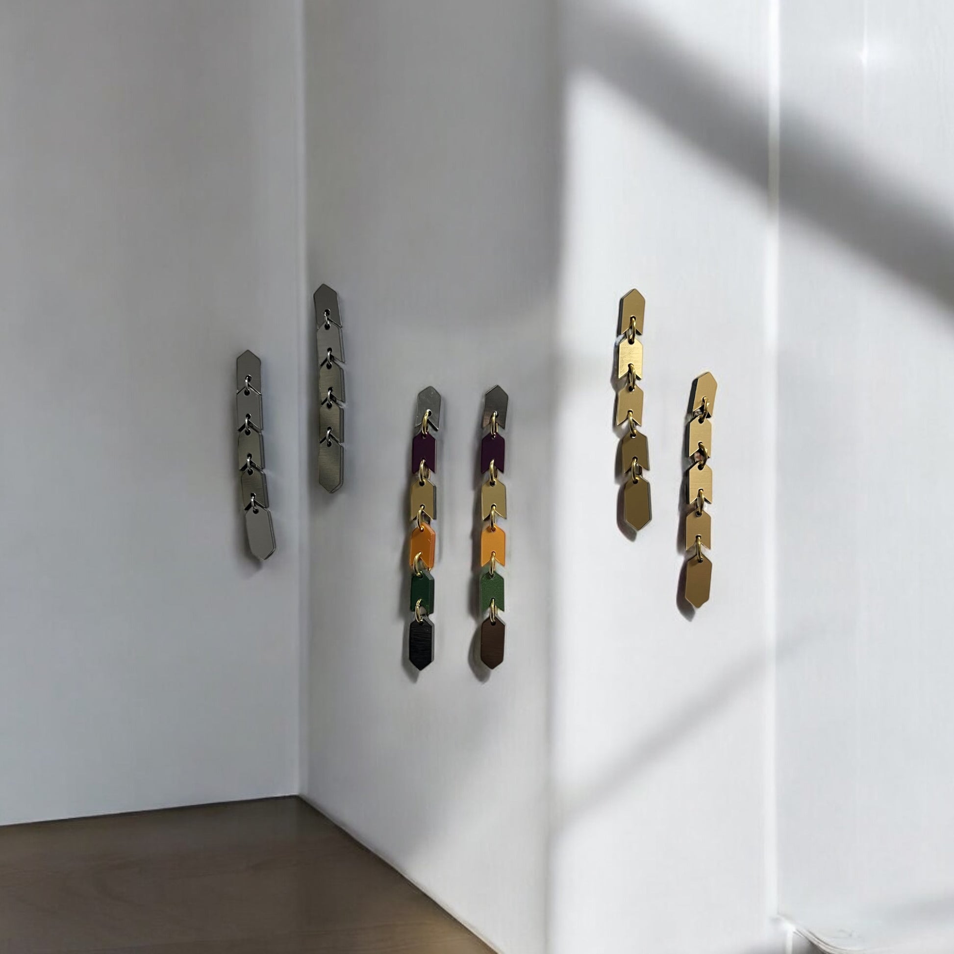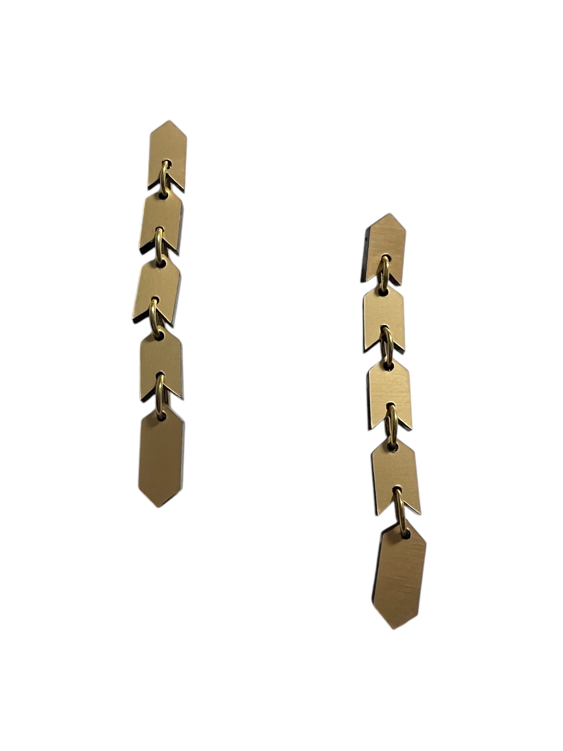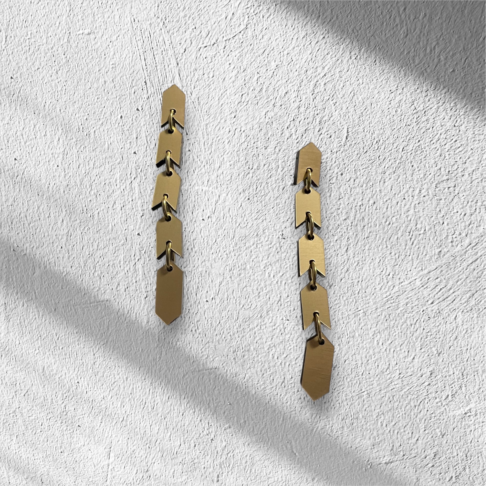 The Sahem Earrings are a sleek chain of arrow-shaped links that exude modern, edgy sophistication. Their unique, snake-like design flows effortlessly, creating a bold and striking accessory for those who love to stand out. Cool, contemporary, and unapologetically daring, these earrings come in two sizes: the gold and silver versions are 8 cm long, while the vibrant multi-colour metallic version extends to 9.5 cm for an even bolder statement. Perfect for the fearless wearer seeking a sleek and unforgettable design.