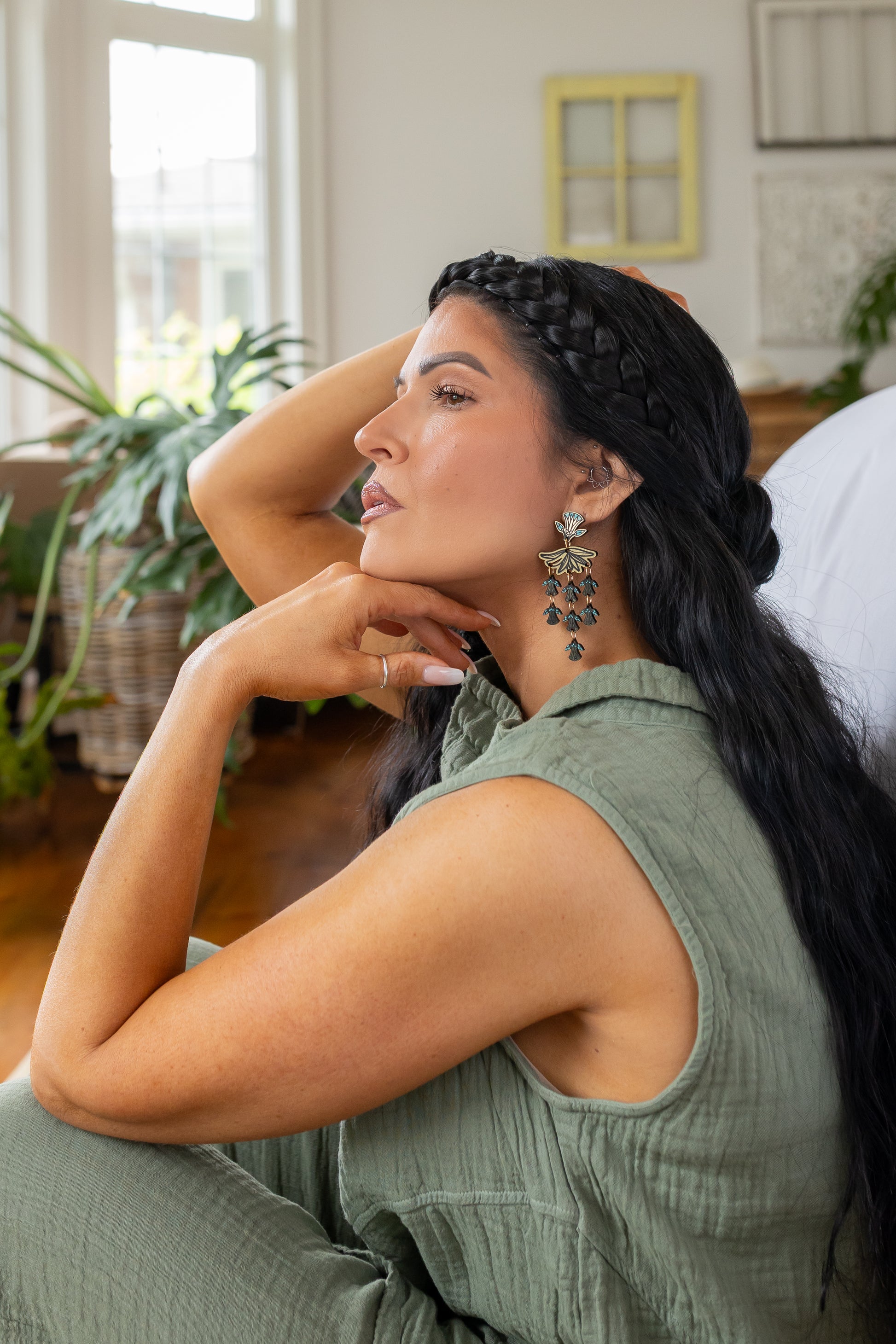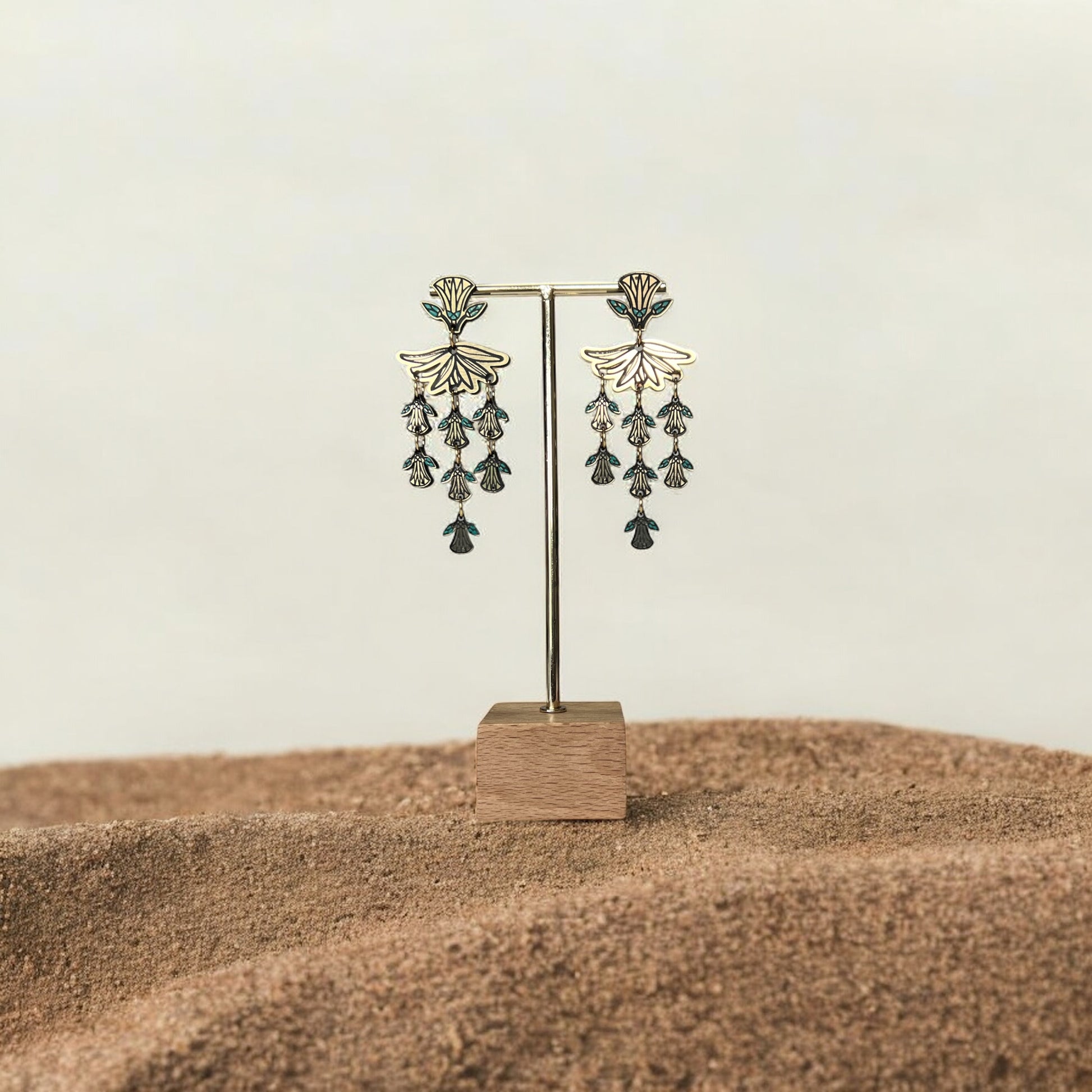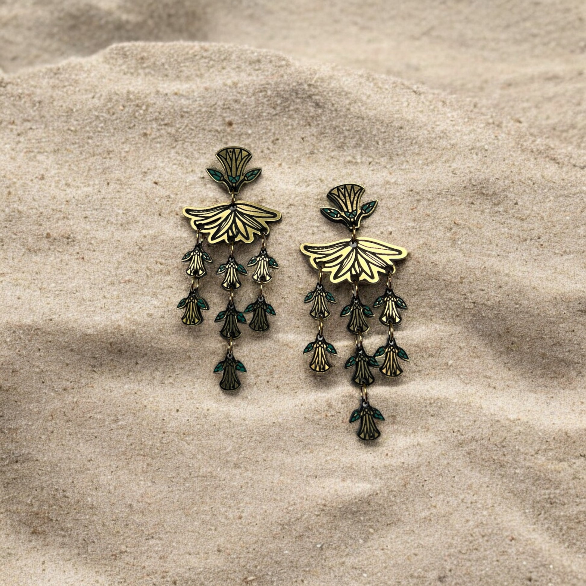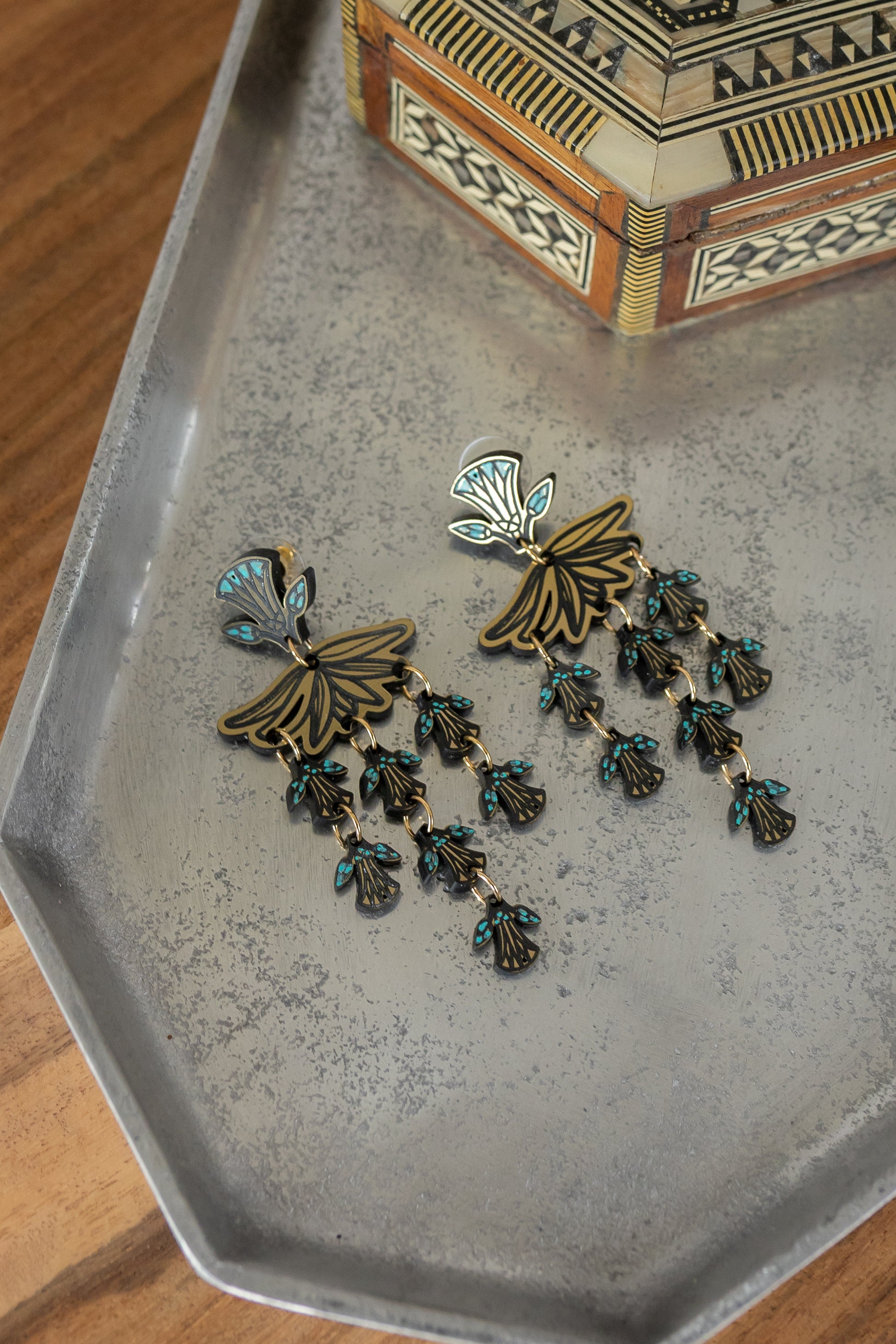 The Shamsa Earrings are a stunning ode to traditional craftsmanship and bold, modern design. Featuring laser-engraved lotus flowers on metallic gold acrylic, each pair is delicately hand-painted and assembled to dance with your every move. These chandelier-style drops are lightweight but full of presence — a statement of elegance and strength.