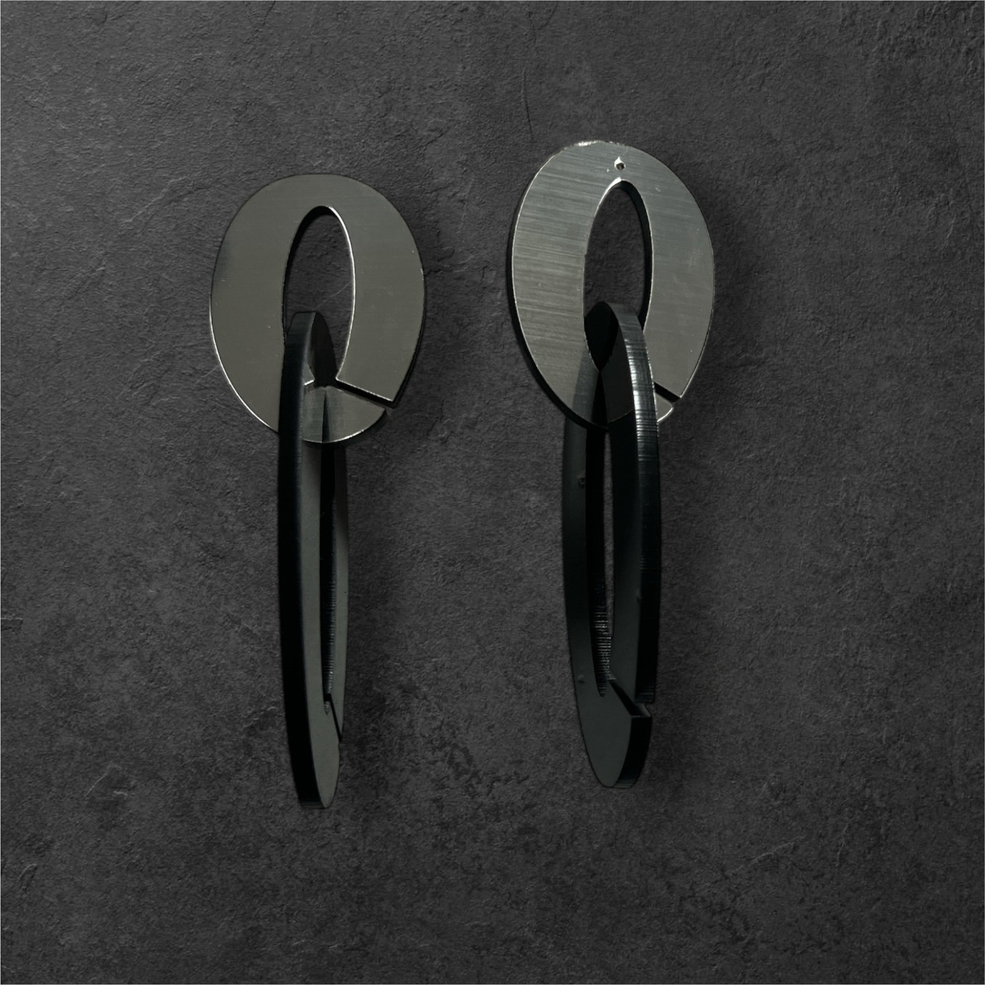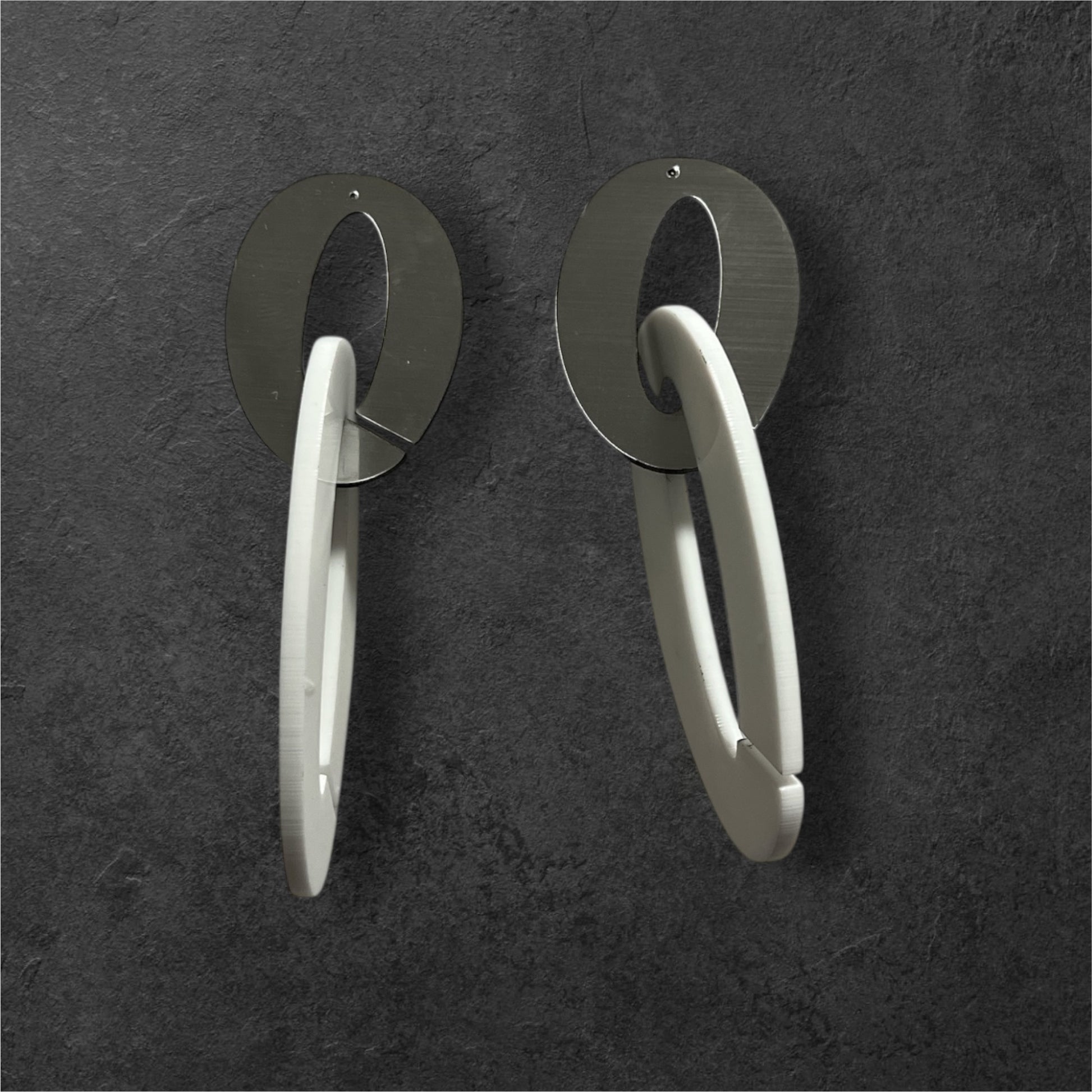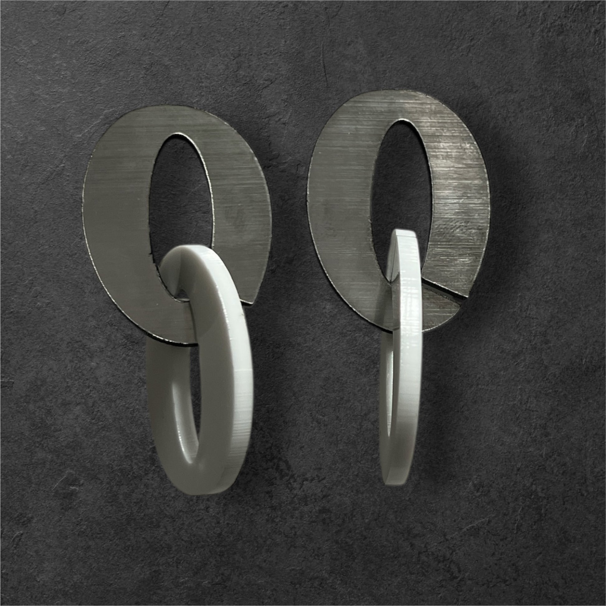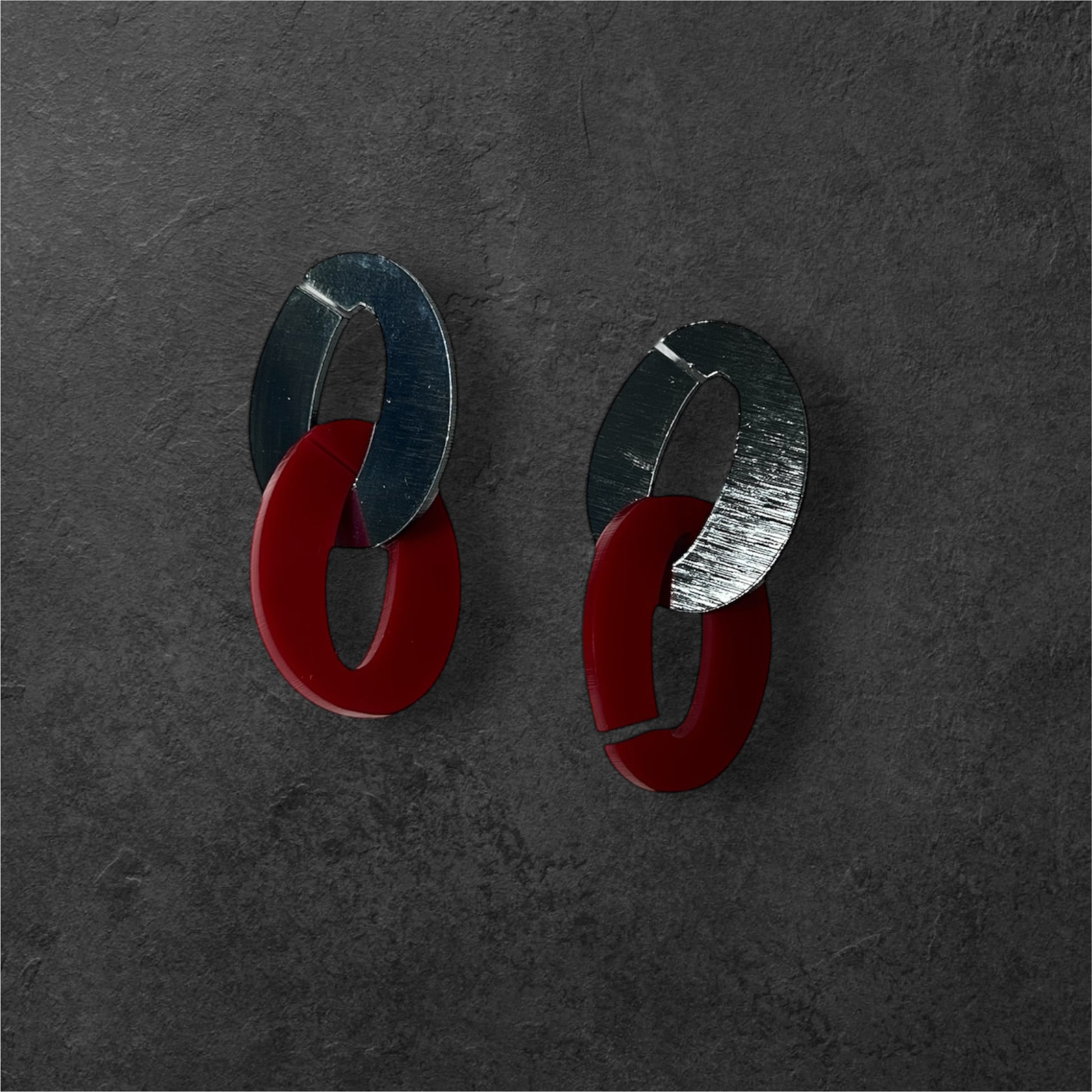 The Echo Earrings are a sleek, architectural take on the classic drop earring — designed with interlocking oval links that move with you and create a clean, modern silhouette. Each pair features a brushed metal top (your choice of gold or silver) paired with smooth, lightweight acrylic links in white, black, or red.
