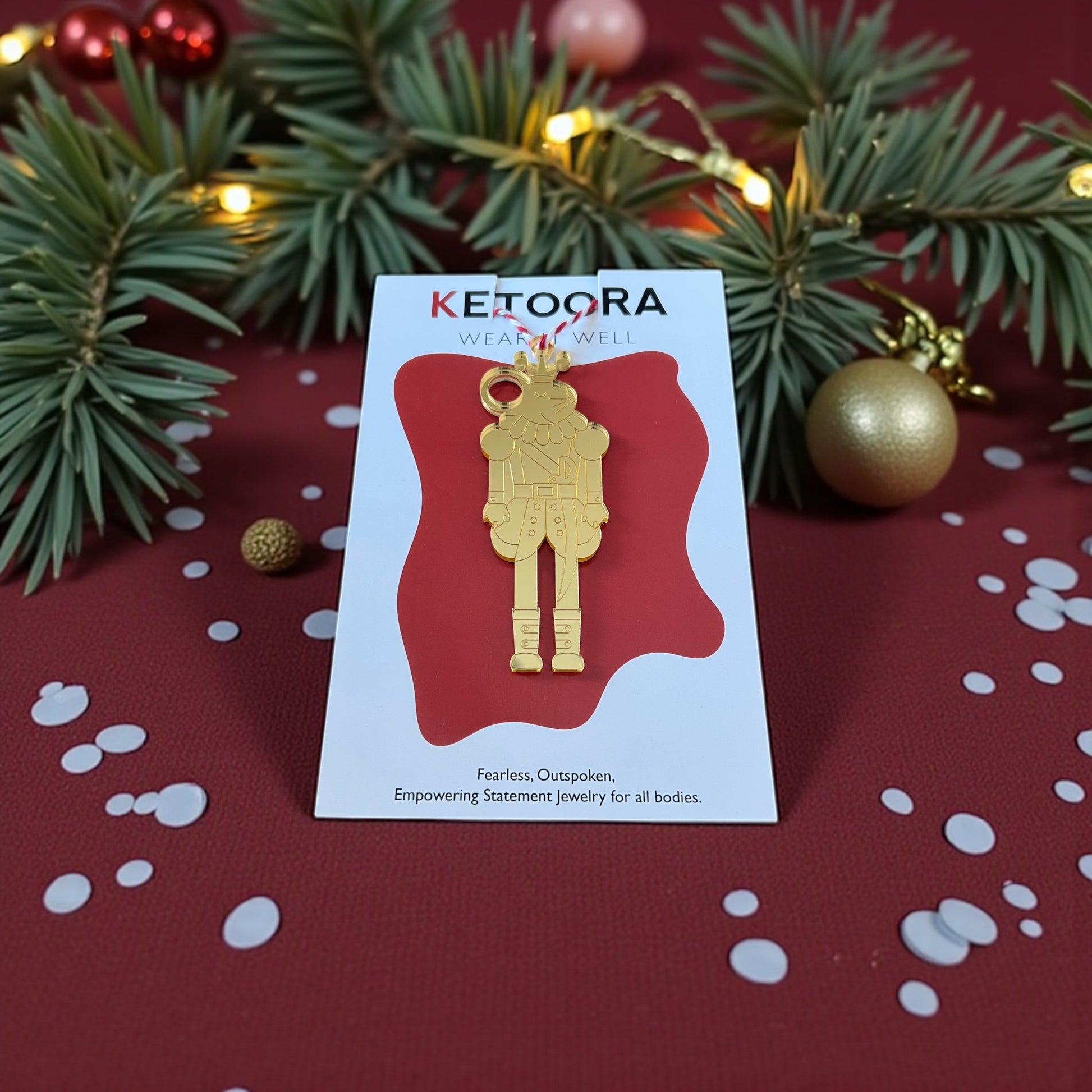 From shiny gold, silver, and rose gold Nutcracker earrings that dance with every move, to matching Nutcracker ornaments ready to sparkle on your tree (or hang somewhere fun all year long 👀), this series is pure holiday joy with a bold Ketoora twist.
