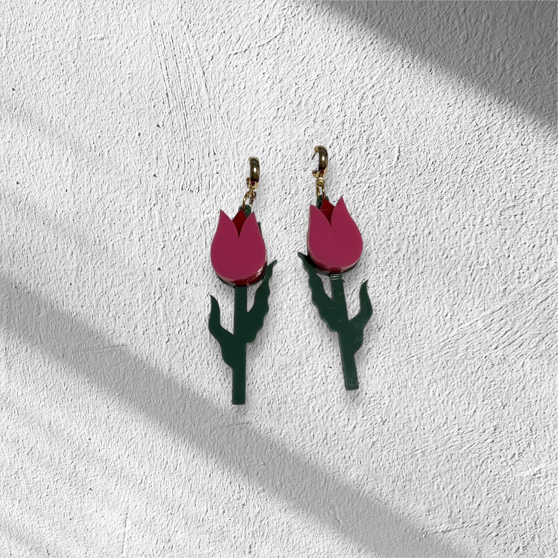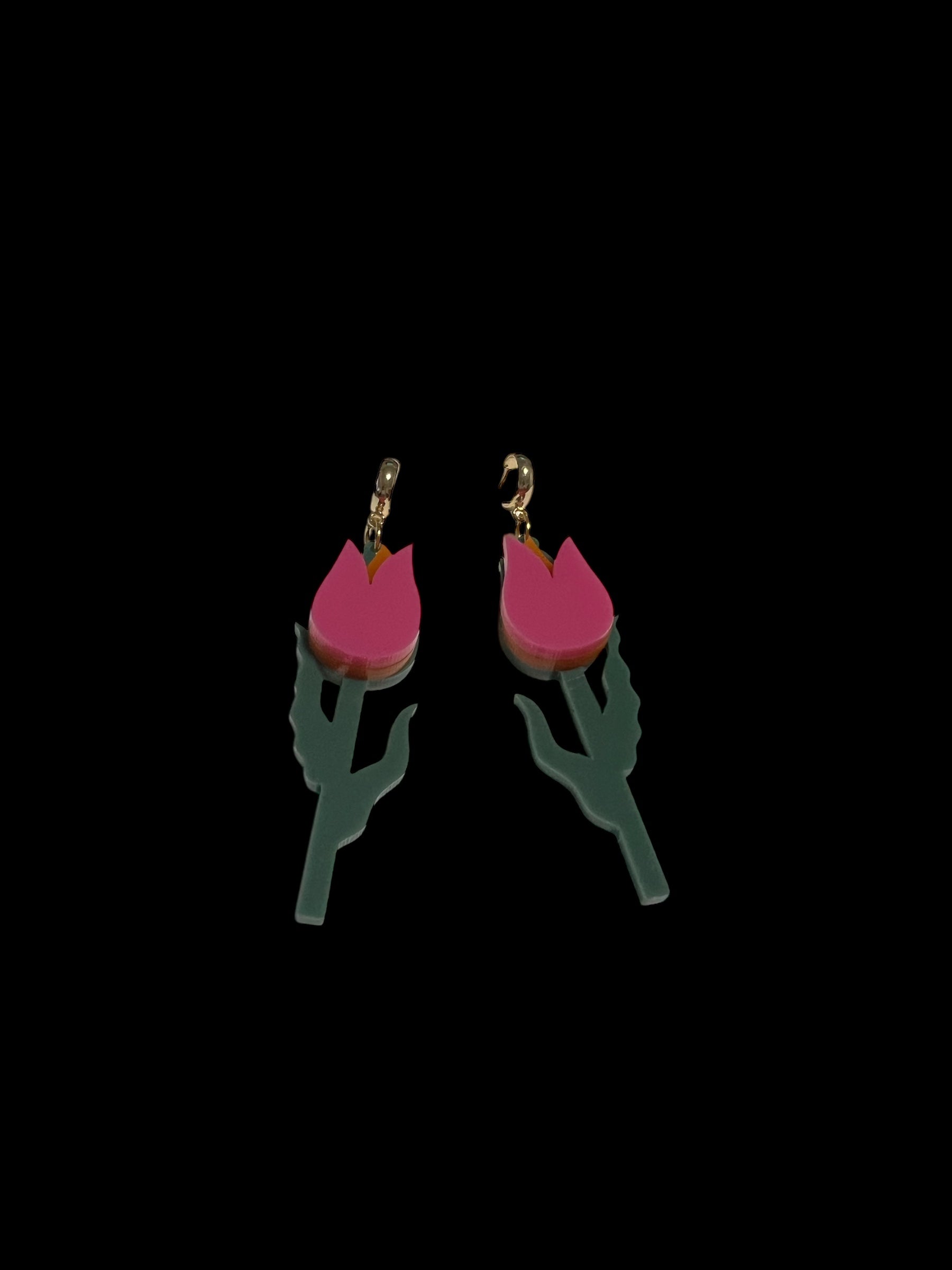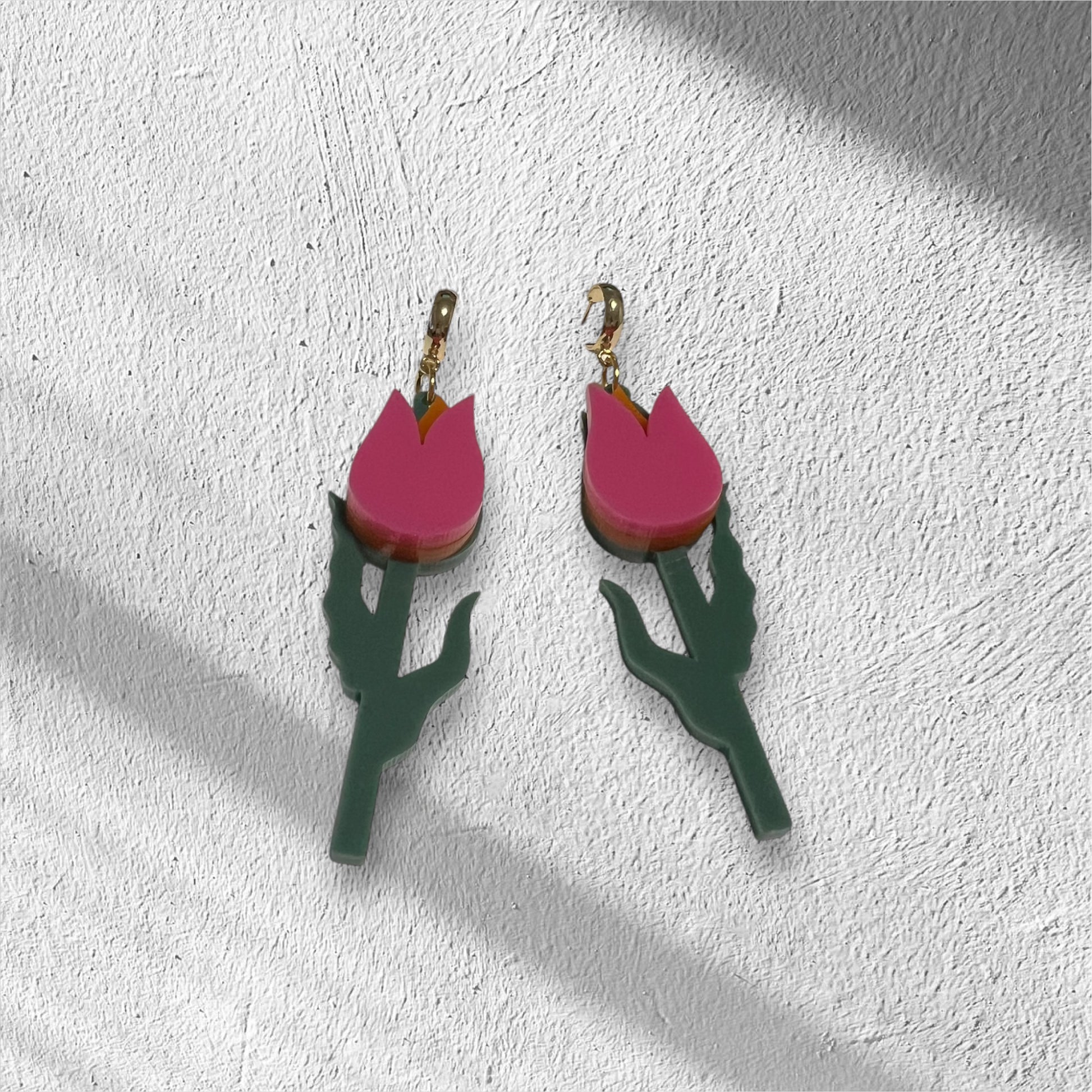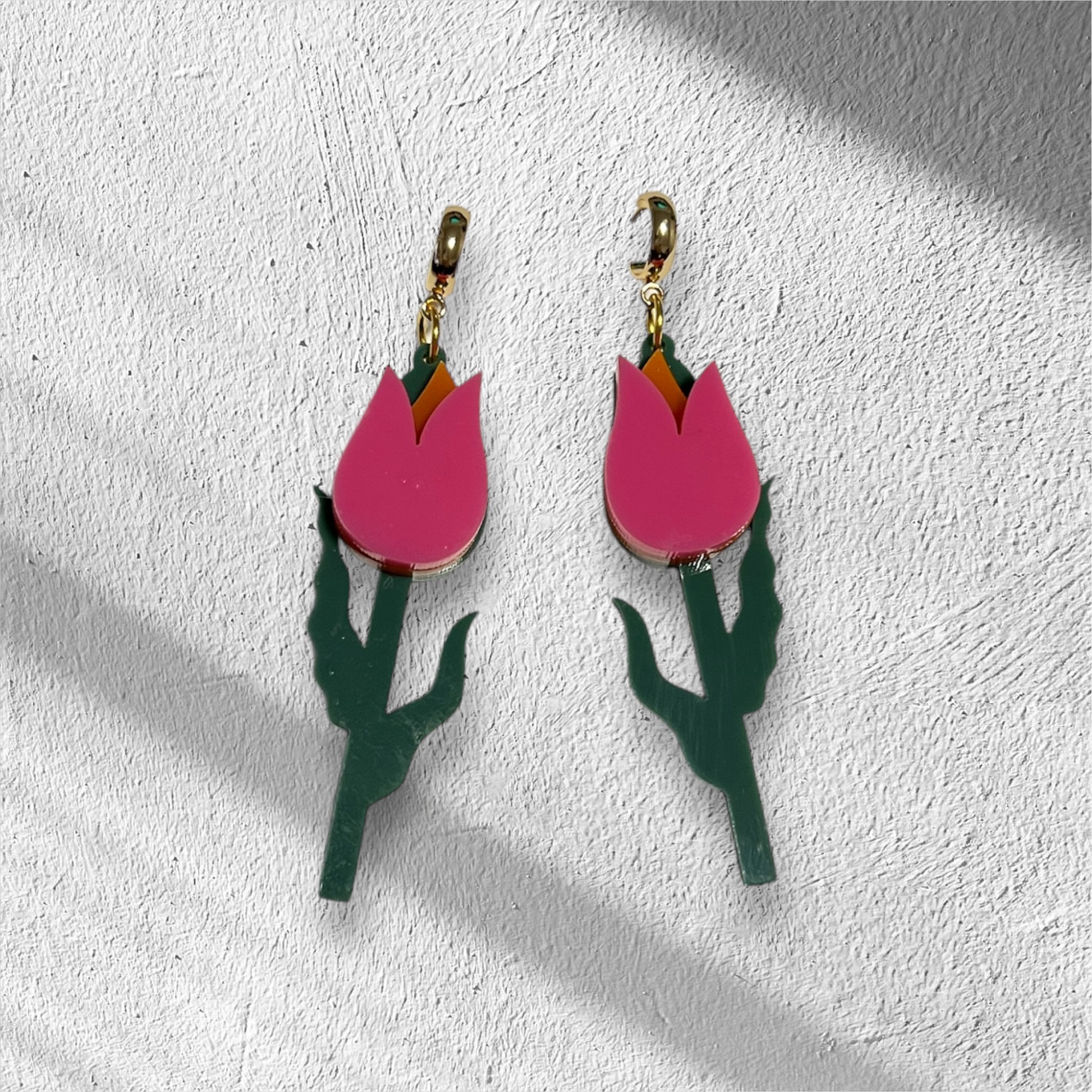 The Tulipe Earrings are a playful and quirky nod to the charm of tulips, featuring whimsical floral shapes hanging gracefully from gold-plated stainless steel posts. Crafted from layered acrylic in vibrant color combinations like pink and orange or pink and red, these earrings are fun, bright, and perfect for embracing the warmth of spring and summer.