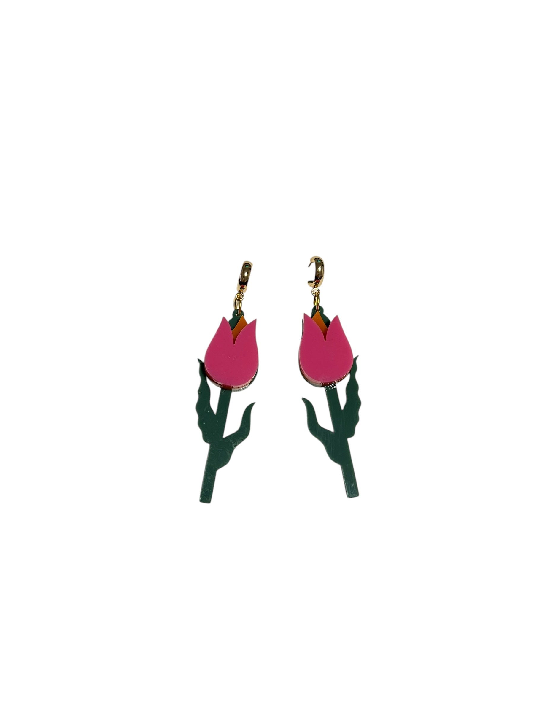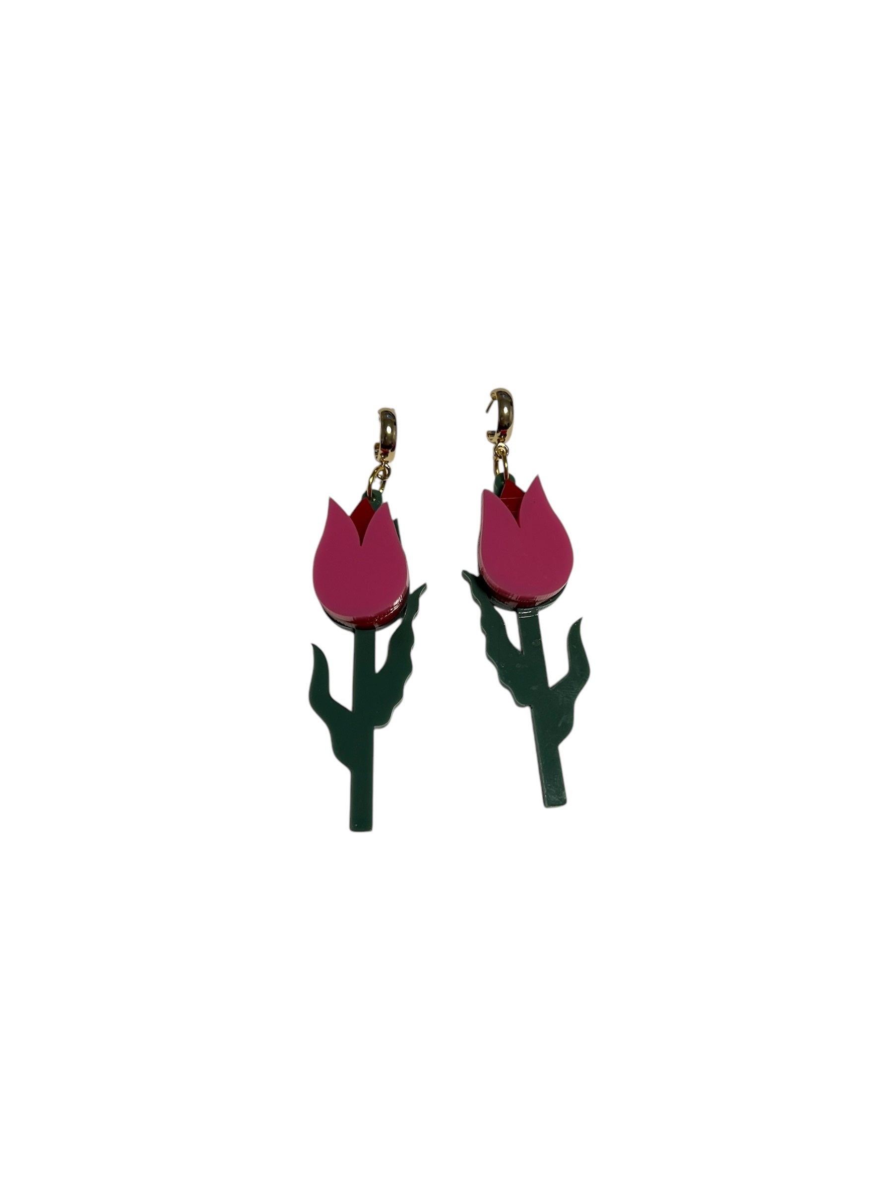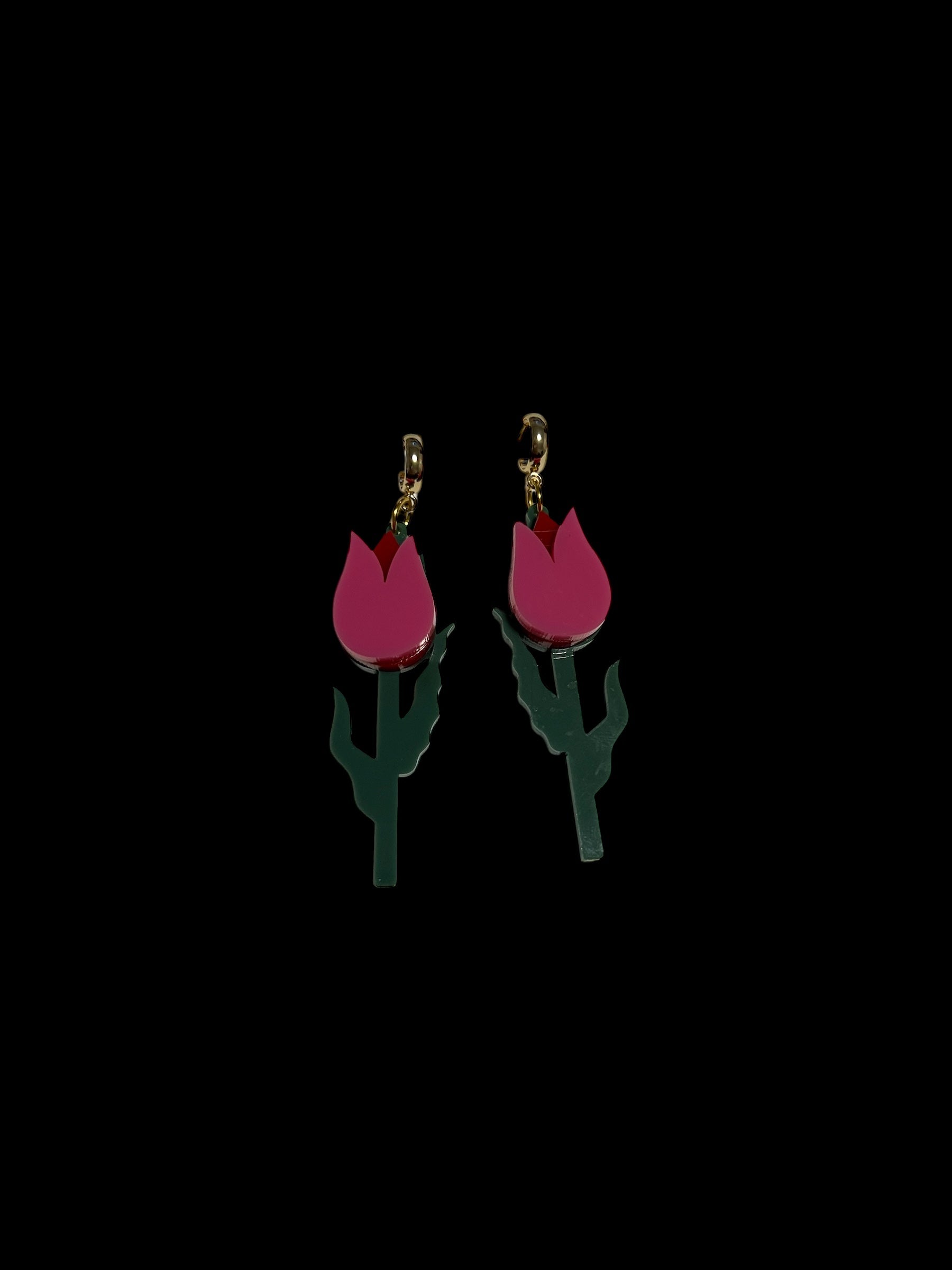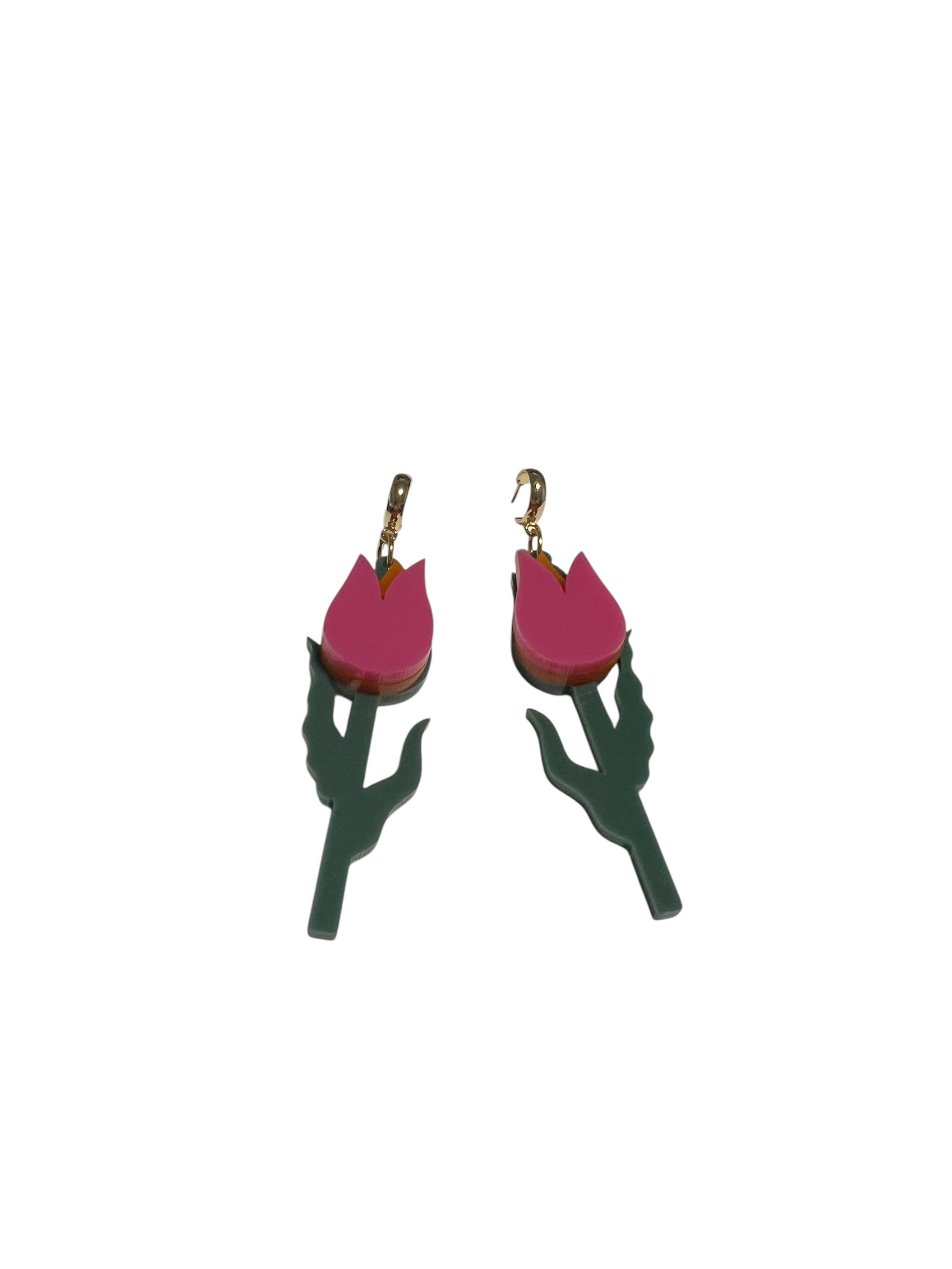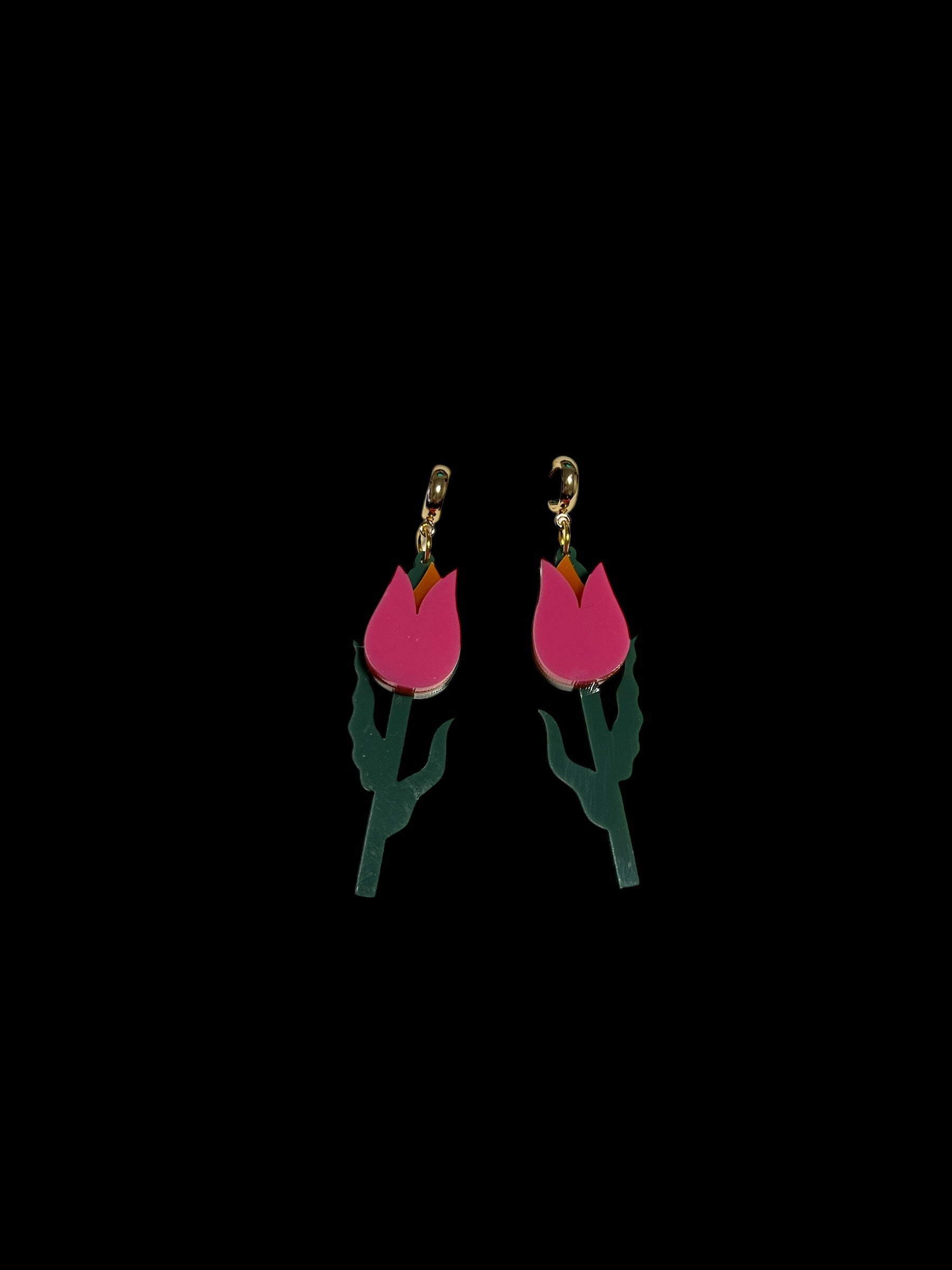 The Tulipe Earrings are a playful and quirky nod to the charm of tulips, featuring whimsical floral shapes hanging gracefully from gold-plated stainless steel posts. Crafted from layered acrylic in vibrant color combinations like pink and orange or pink and red, these earrings are fun, bright, and perfect for embracing the warmth of spring and summer.